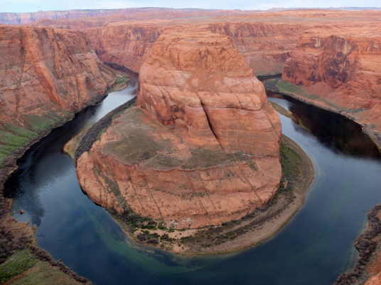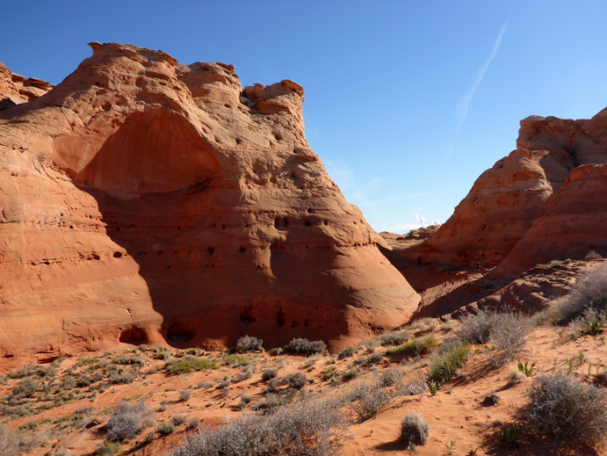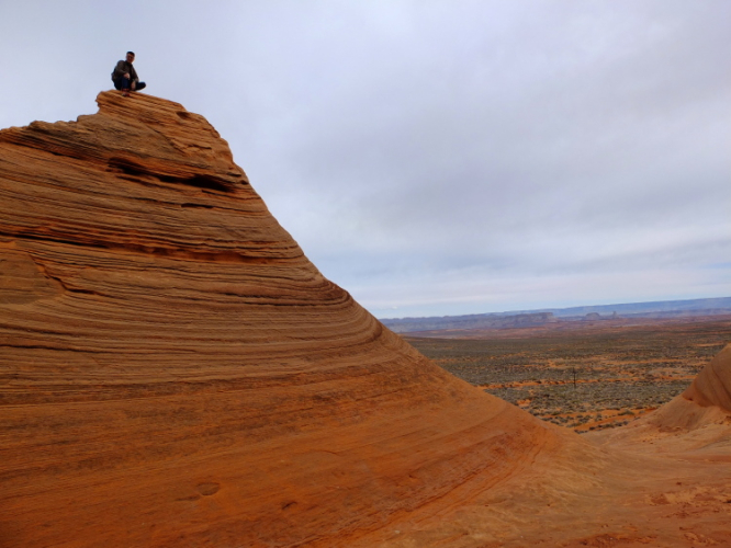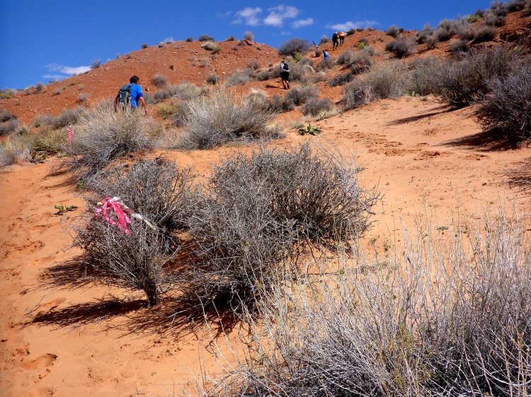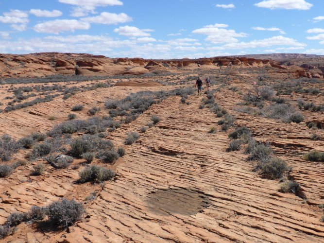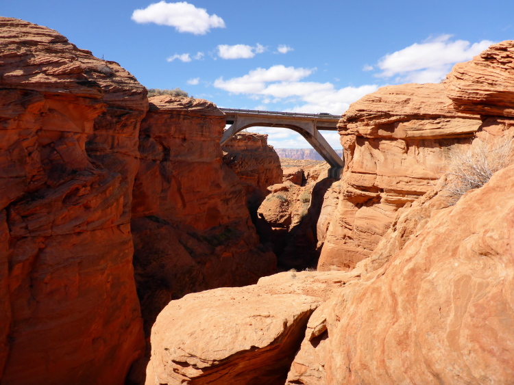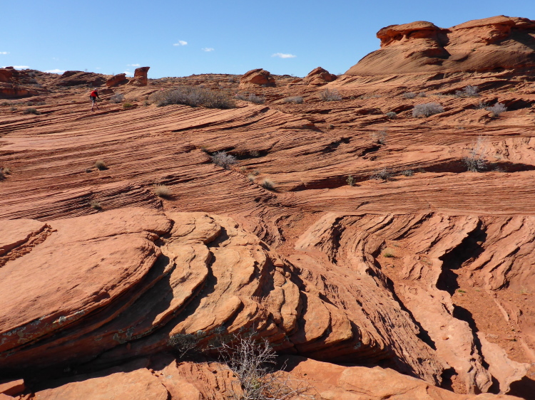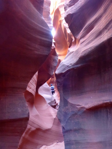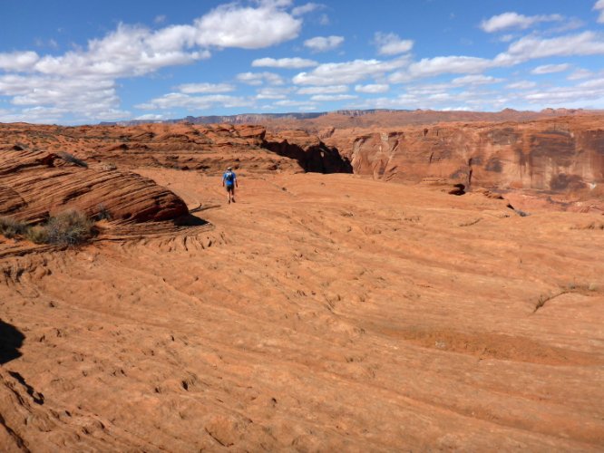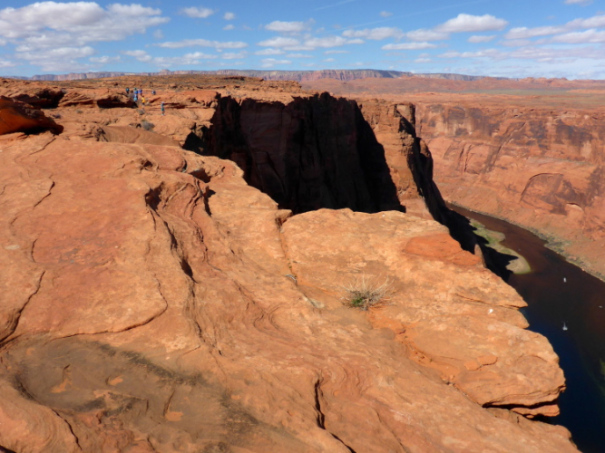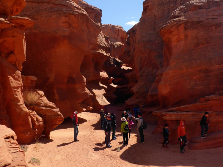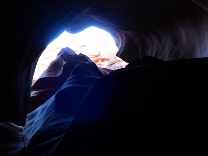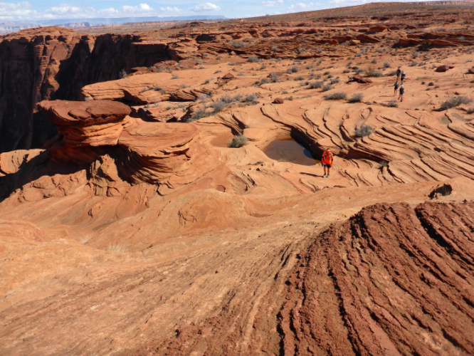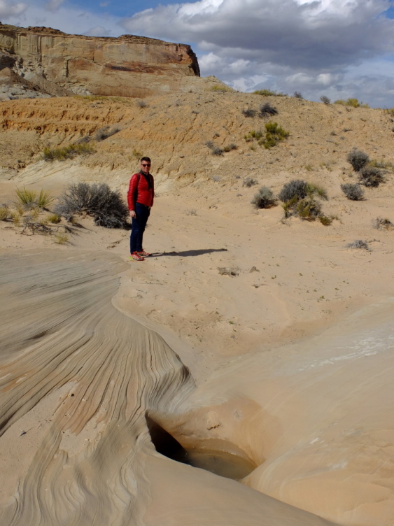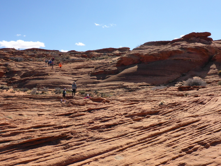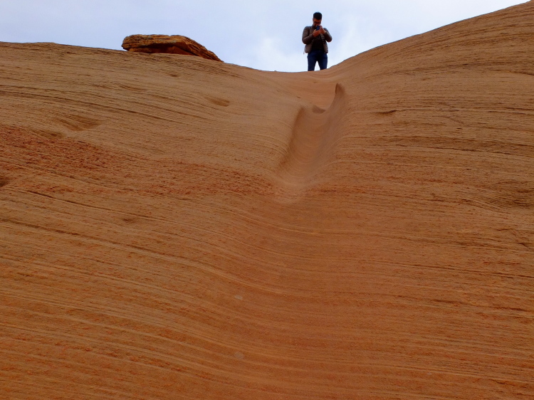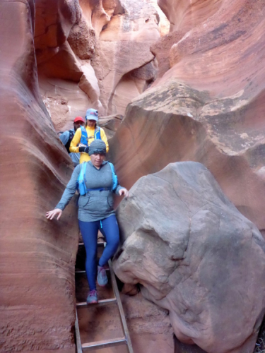 Wir begleiten den Colarado River am Rand entlang. Hier gibt es keine Absturzsicherung. Du kannst gehen bis an den äußersten Rand. Die Strecke ist einfach der Hammer. Aber auch anstrengend. In stetigem Auf und Ab geht es bis zu einer weiteren Schleife, an der wir den Fluss in Richtung Waterhole Canyon verlassen. Durch tiefen Sand erreichen wir den VP am Eingang zum Canyon. In einer wilden Kraxelei geht es bis zum Grund und wir verschwinden in einer schmalen Felsspalte. Mal über Leitern, mal mit Klettereinlagen durchqueren wir den Flusslauf, der bei Regenereignissen, wie die anderen Slot-Canyons gesperrt ist.