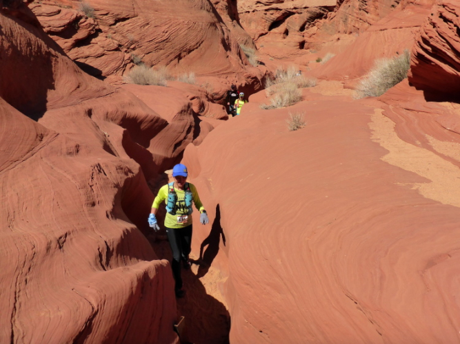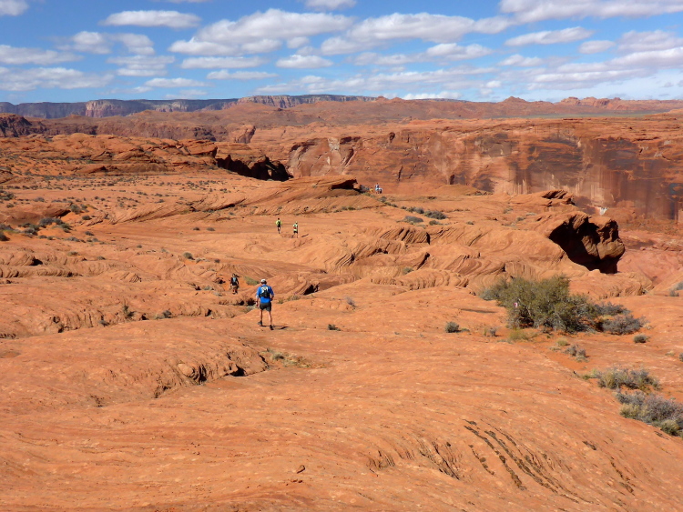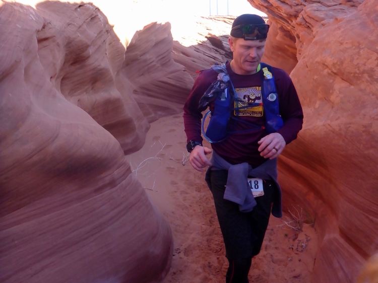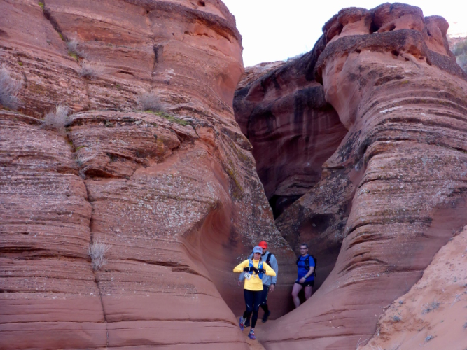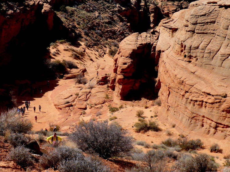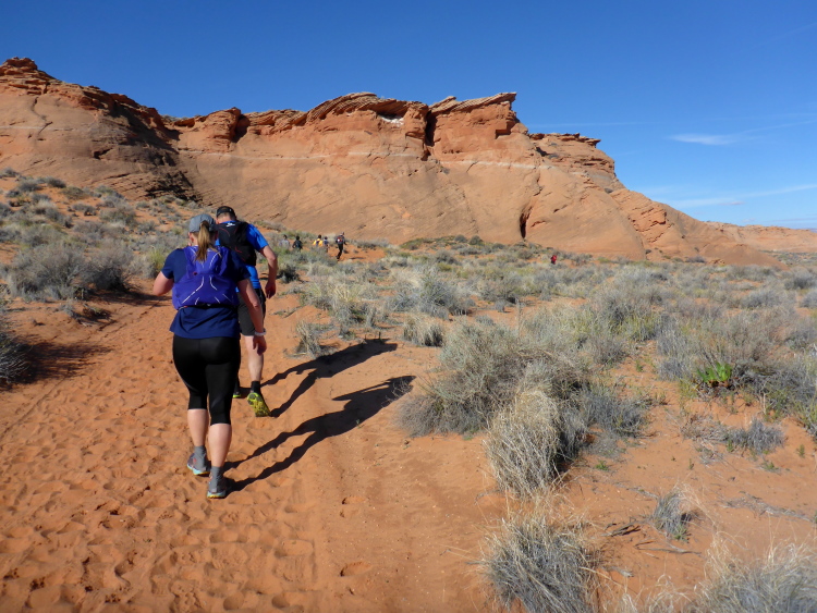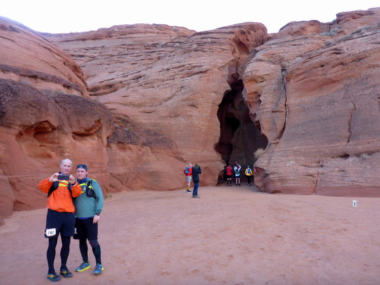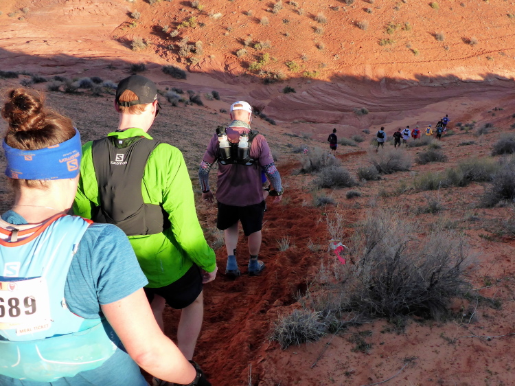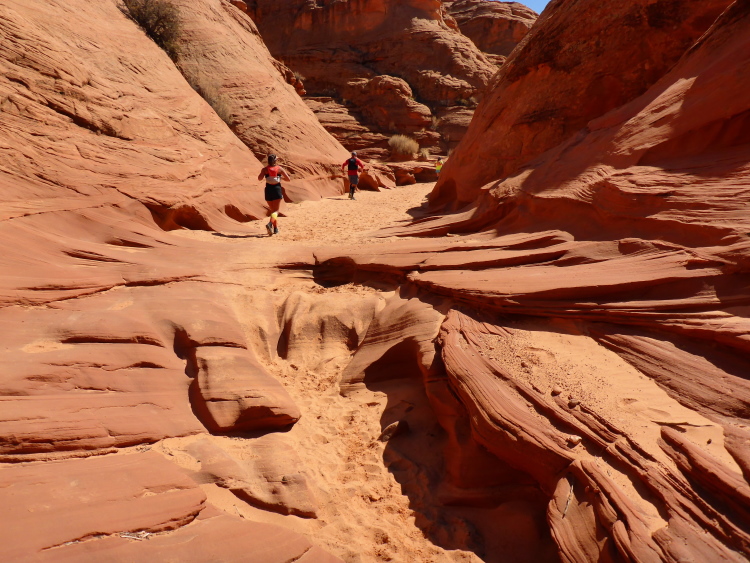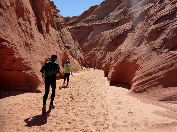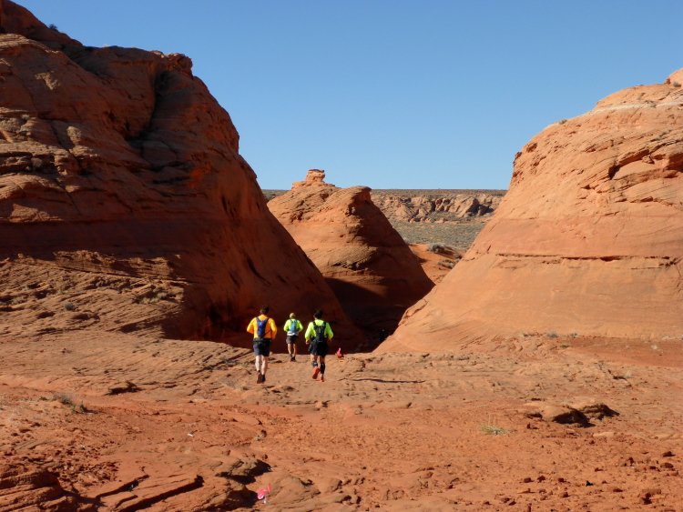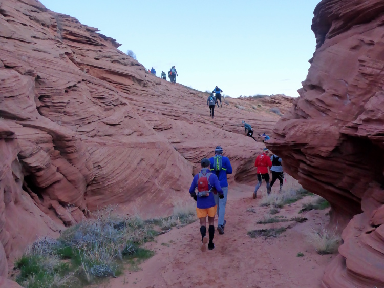 Schon nach wenigen Meilen tauchen wir ein in den ersten Slot Canyon. Die ausgewaschenen Felsen werden immer dichter und sind manchmal gerade noch so breit wie ein schmaler Läufer. Ein paar hundert Meter kann eine solche Felsspalte lang sein. Wir überqueren einen Kamm und kommen zum ersten VP, den ich auslasse. Jetzt geht es durch ein breites Tal in Richtung Antelope Canyon. Um diese Zeit sind noch keine Touristen unterwegs und so haben die Runner das Schauspiel ganz für sich.