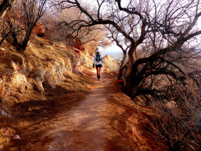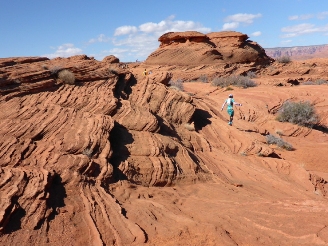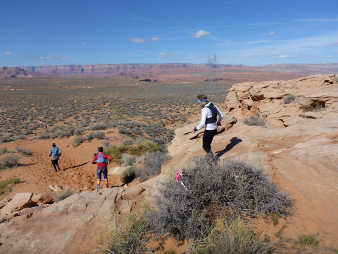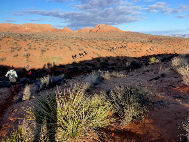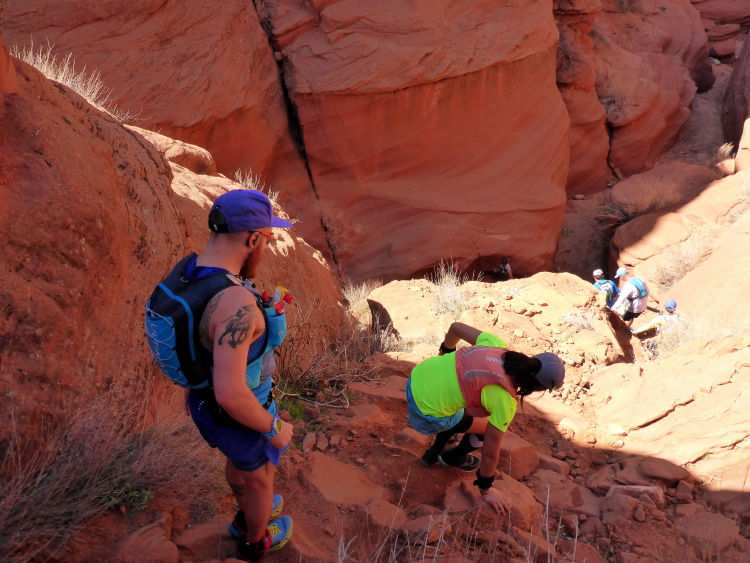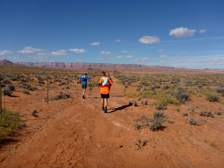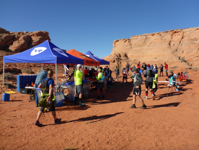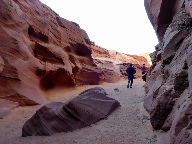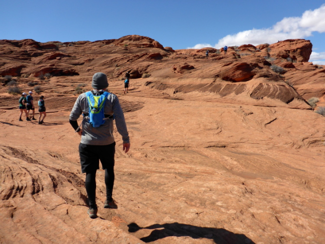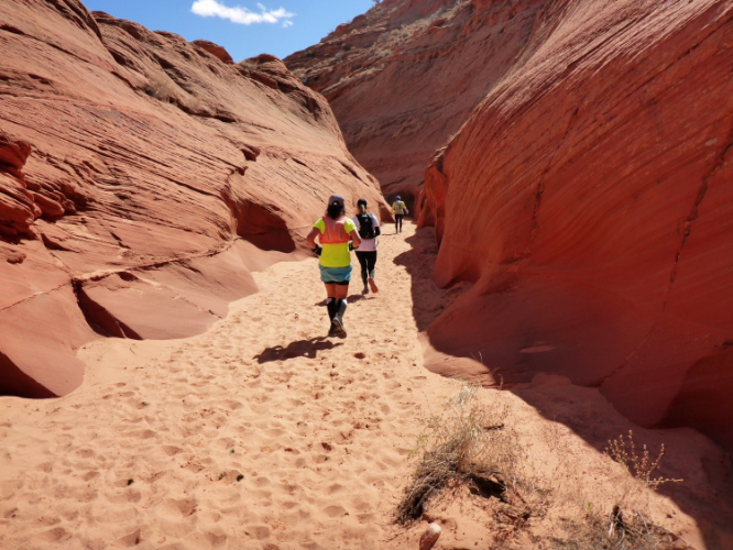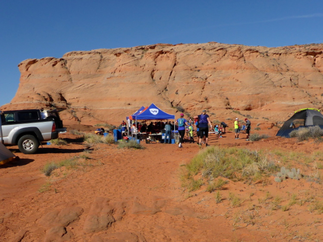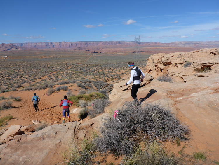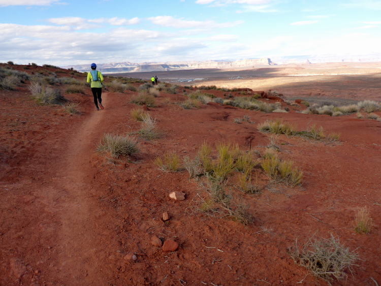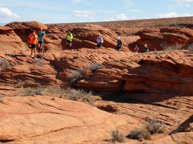 Schon nach wenigen Meilen tauchen wir ein in den ersten Slot Canyon. Die ausgewaschenen Felsen werden immer dichter und sind manchmal gerade noch so breit wie ein schmaler Läufer. Ein paar hundert Meter kann eine solche Felsspalte lang sein. Wir überqueren einen Kamm und kommen zum ersten VP, den ich auslasse. Jetzt geht es durch ein breites Tal in Richtung Antelope Canyon. Um diese Zeit sind noch keine Touristen unterwegs und so haben die Runner das Schauspiel ganz für sich.