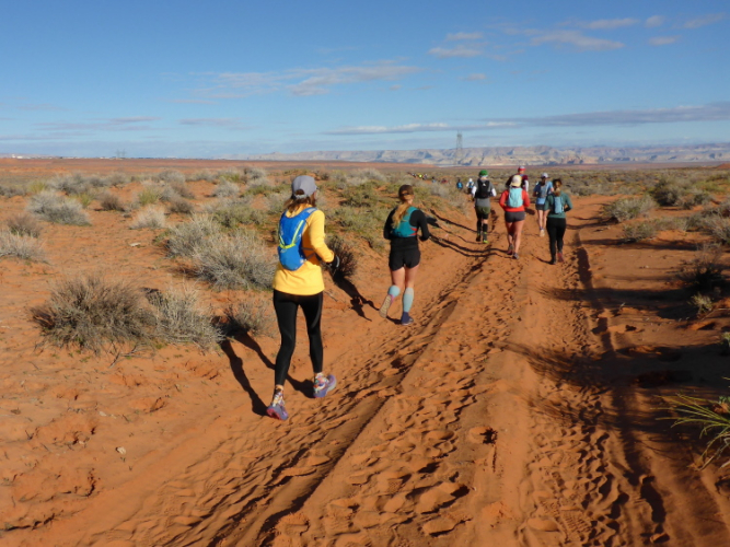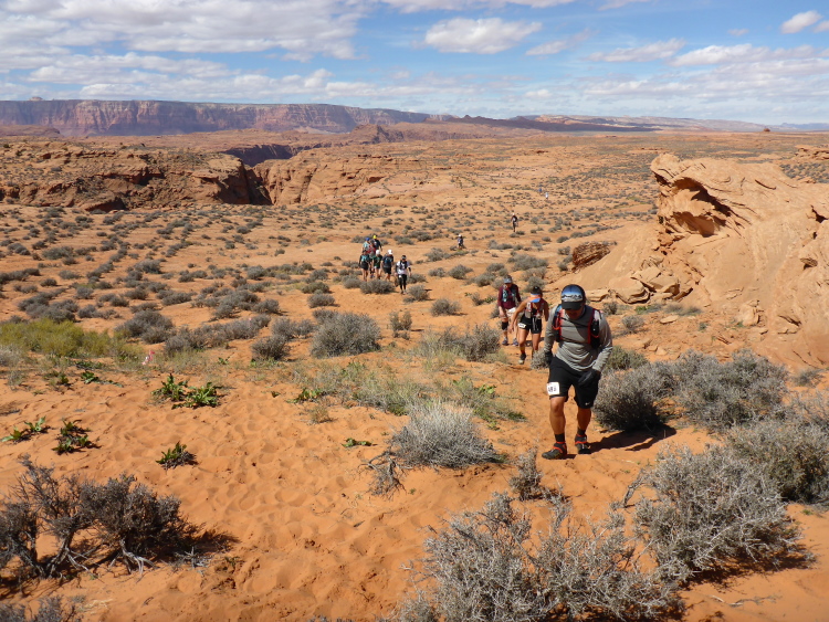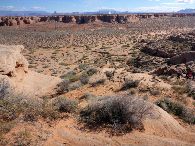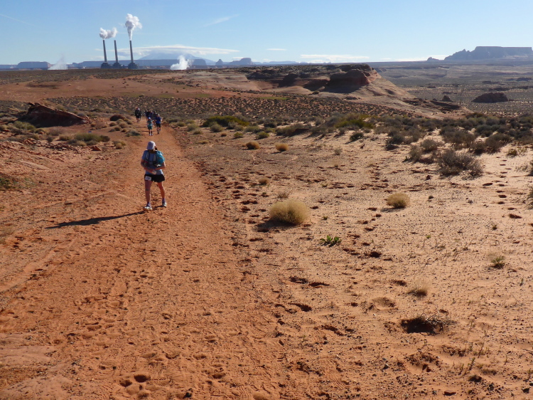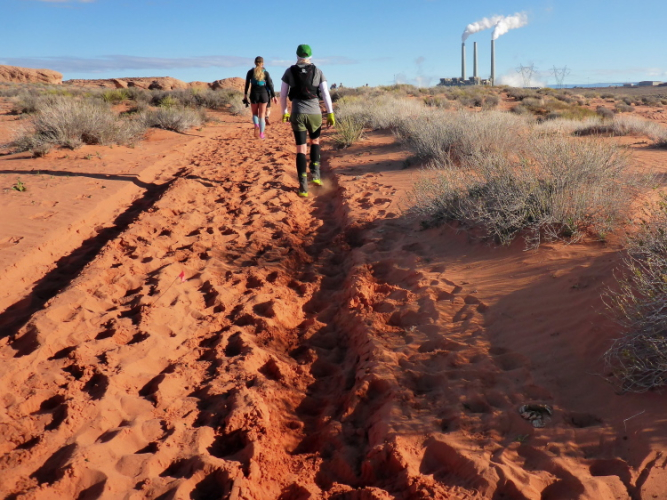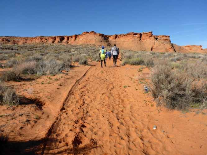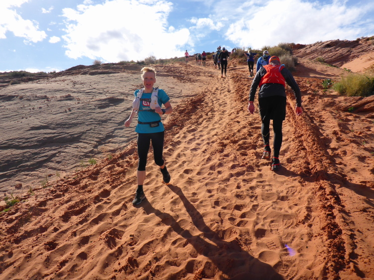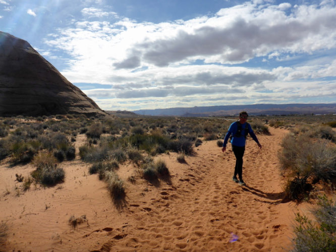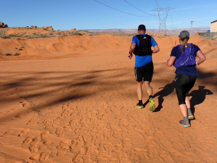 Über die sandige Hochebene geht zum zweiten Mal zum VP Horseshoe Bend. Dort werden erst die Füße begutachtet. Dank meiner Gamaschen werde ich vom Sand verschont. Trotzdem habe ich zwei Blasen an der Ferse. Liegt wohl an den anderen Einlagen, die ich auf so langen Strecken noch nicht ausprobieren konnte. Egal. Ich steche die Blasen auf, ziehe frische Socken an und weiter geht es in Richtung Page. Immer wieder wechseln sich Sand mit Fels ab, wobei der Sandanteil deutlich überwiegt. Das Laufen wird zur Qual. Zum Glück sind die Temperaturen angenehm. Der aufkommende Wind ist sogar recht frisch, was mir bei der Schinderei aber eher willkommen ist.