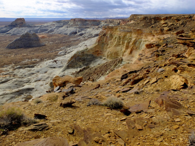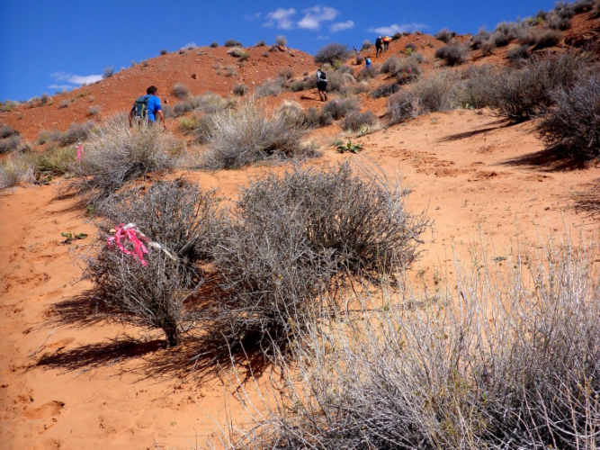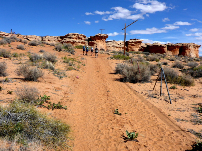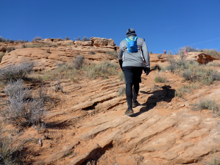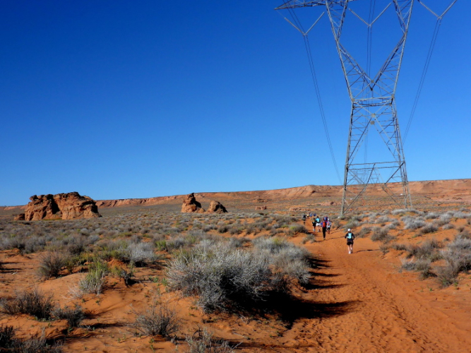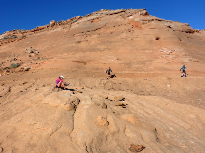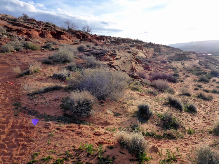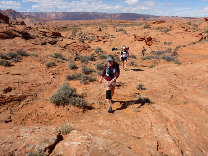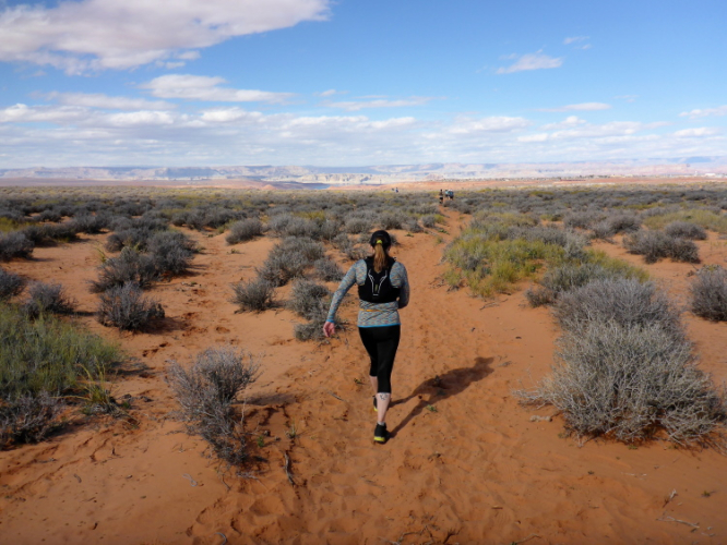 Über die sandige Hochebene geht zum zweiten Mal zum VP Horseshoe Bend. Dort werden erst die Füße begutachtet. Dank meiner Gamaschen werde ich vom Sand verschont. Trotzdem habe ich zwei Blasen an der Ferse. Liegt wohl an den anderen Einlagen, die ich auf so langen Strecken noch nicht ausprobieren konnte. Egal. Ich steche die Blasen auf, ziehe frische Socken an und weiter geht es in Richtung Page. Immer wieder wechseln sich Sand mit Fels ab, wobei der Sandanteil deutlich überwiegt. Das Laufen wird zur Qual. Zum Glück sind die Temperaturen angenehm. Der aufkommende Wind ist sogar recht frisch, was mir bei der Schinderei aber eher willkommen ist.