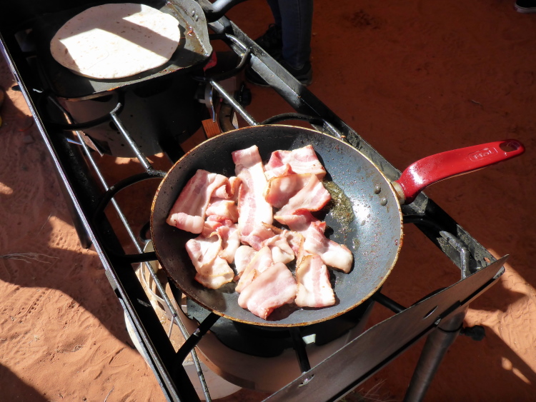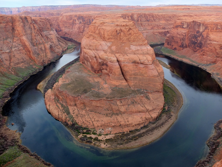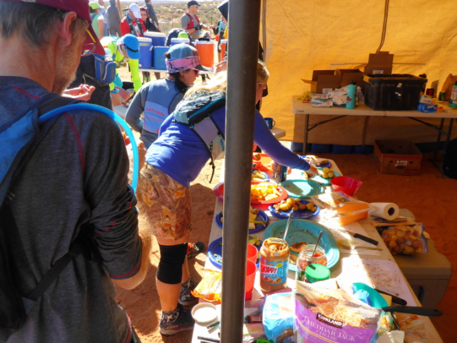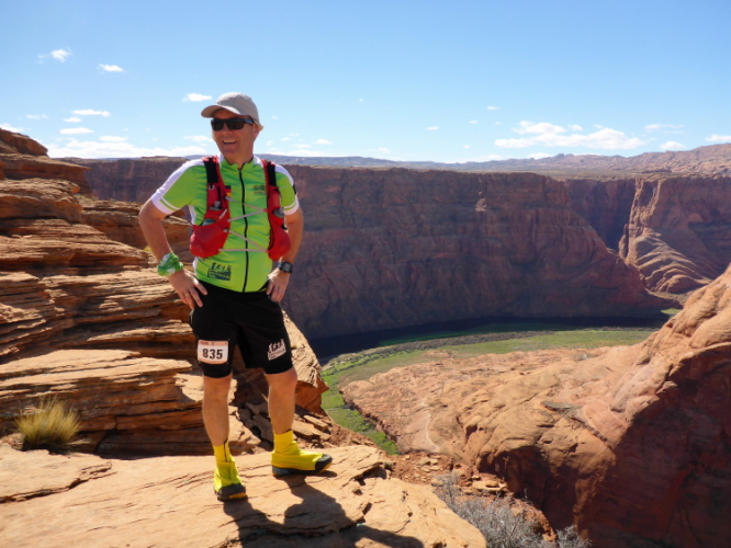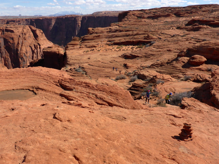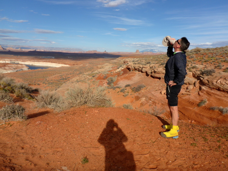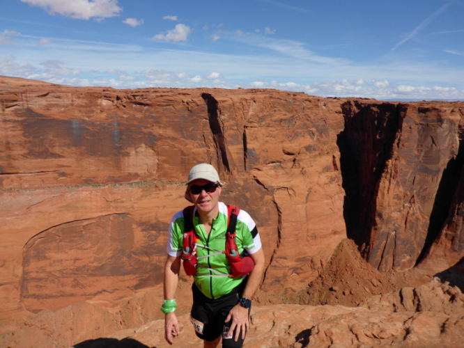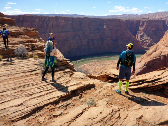 Zum Glück hatten wir uns den Canyon schon vorher in aller Ruhe angeschaut. Die Formen und Farben sind einfach atemberaubend und es wäre schade, nur kurz durchzuhuschen. Am Ende weitet sich die Felsspalte dann unvermittelt und zurück geht es parallel in einem weiteren Slot-Canyon zum gleichen VP wie vorhin. Von dort führt die Strecke, mal sandig, mal über schroffen Fels über eine lange Ebene in Richtung Horseshoe Bend. An dem reich bestückten VP (mit Bacon und Tortillas) wird dann mal nachgetankt. Bananen-Nutella-Wraps geben genug Energie für die nächsten tausend Kilometer und weiter geht’s zum Hufeisen des Colorade Rivers. Der Fluss hat sich mehrere hundert Meter tief eingeschnitten und macht eine 180 Grad Wende. Ich stehe am Rand und bin überwältigt. Das ist es, warum ich laufe. Diese unbeschreiblichen Erlebnisse in faszinierender Landschaft.