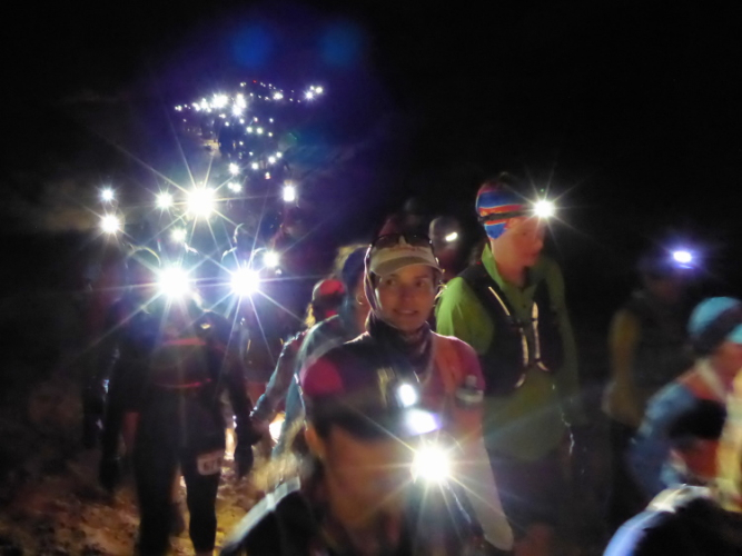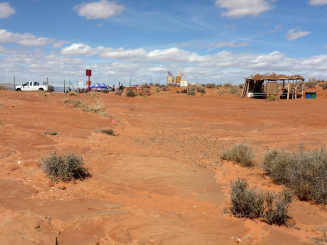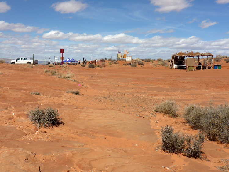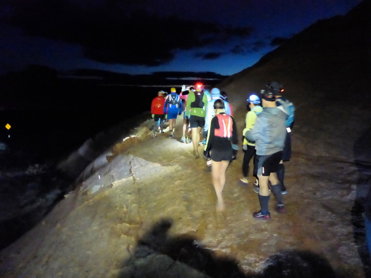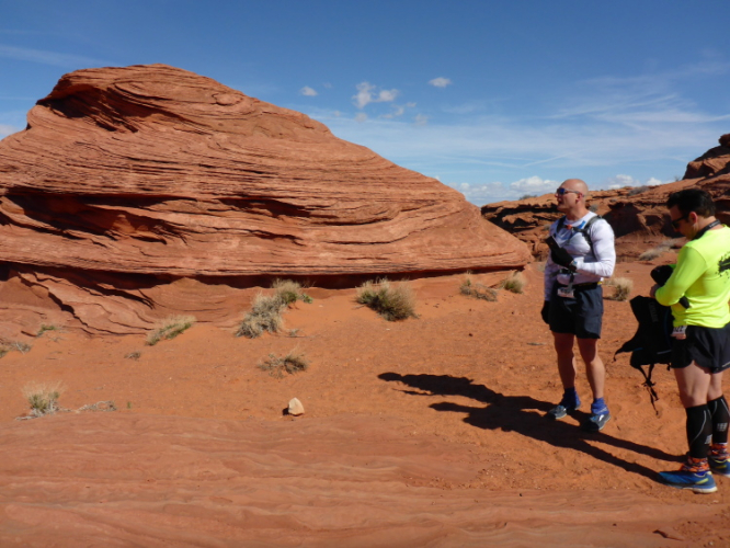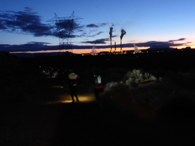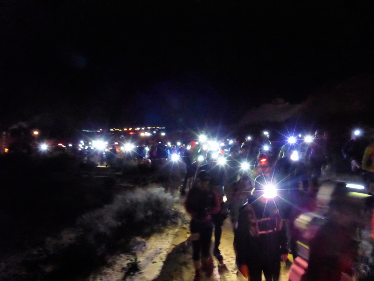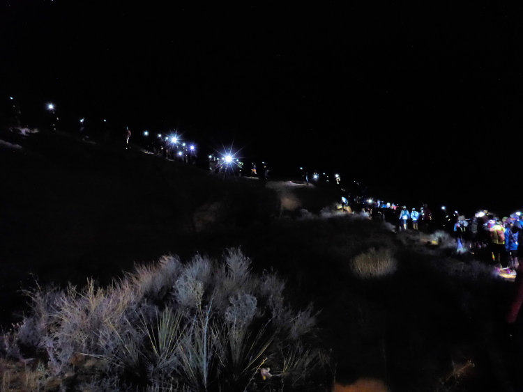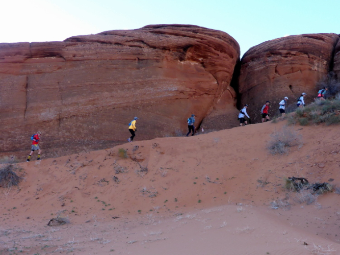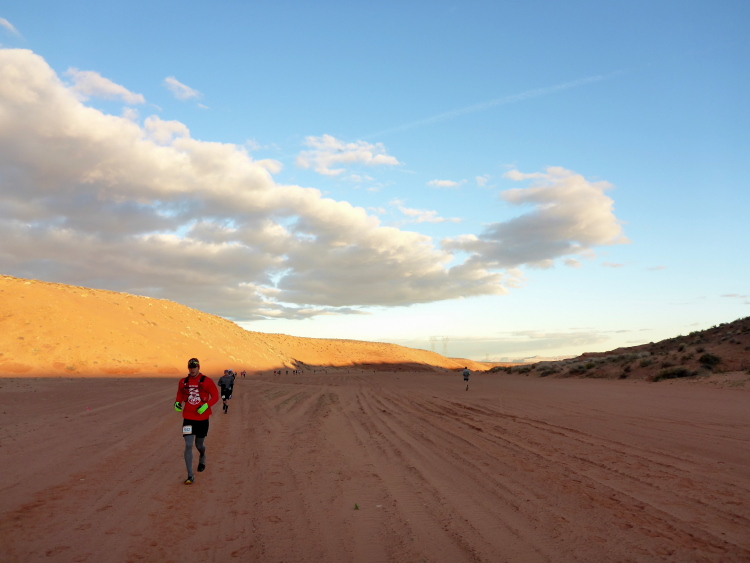 Am nächsten Morgen geht es dann im Dunkeln zum Amphit Theatre, einer natürlichen Felsformation vor den Toren der Stadt. Nach einer kurzen Ansprache und einem Gebet der Navajos werden wir auf die Strecke geschickt. Durch tiefen Sand geht es auf die ersten Felsen zu. Alles ohne Gedränge, alles sehr gelassen und ohne Hektik. Ein Verhalten, dass mir schon die ganze Woche aufgefallen ist.