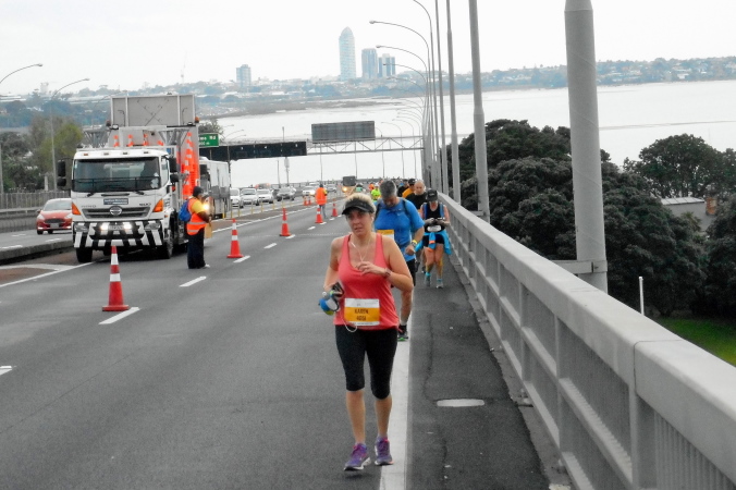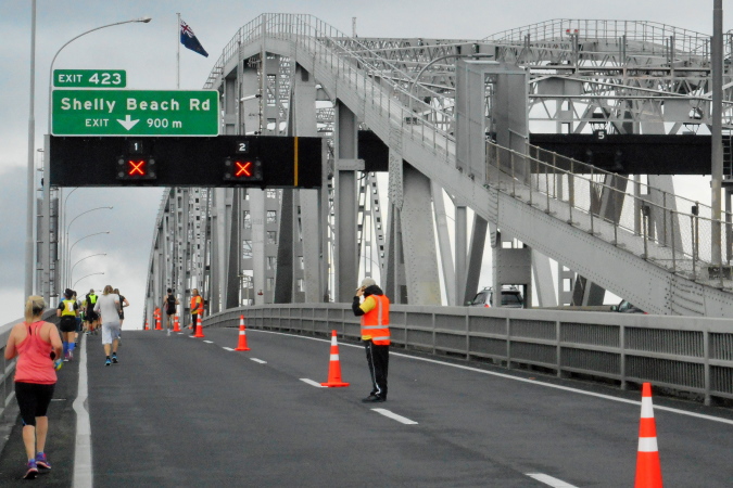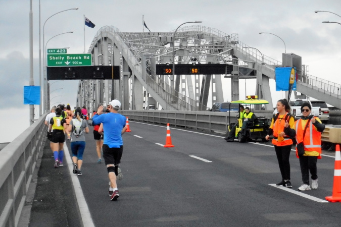 Nach etwa 14 Kilometern wird es spannend: Es geht hoch auf die im Mai 1959 nach 4 Jahren Bauzeit eröffnete, etwas über einen Kilometer lange Harbour Bridge. Von den acht Spuren sind zwei für die Läufer reserviert. Der Anstieg und das Gefälle sind zwar nicht so heftig wie etwa auf der Köhlbrandbrücke im Hamburger Hafen, aber auch schon ganz ordentlich; sie hat eine lichte Höhe von 43 Metern. Verkehrstechnisch ist diese Brücke von enormer Bedeutung: Vor ihrer Eröffnung gelangte man von den nördlichen Stadtteilen aus zum Hafen nur mit Fähren oder (auf Straßen) mit einem Umweg von 40 Kilometern über die westlichen Stadtteile.