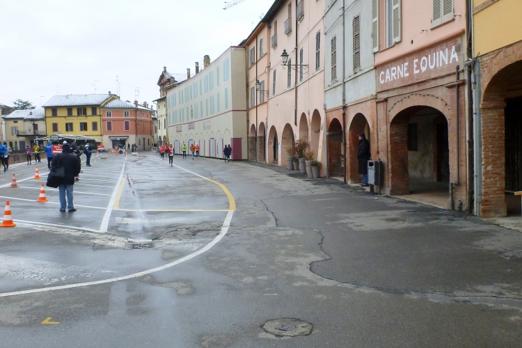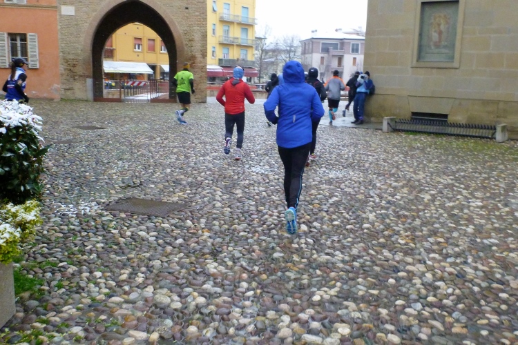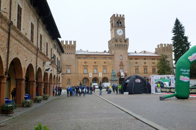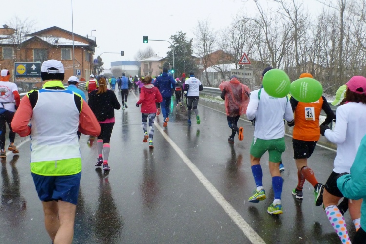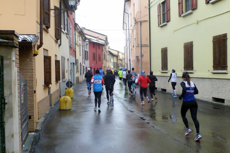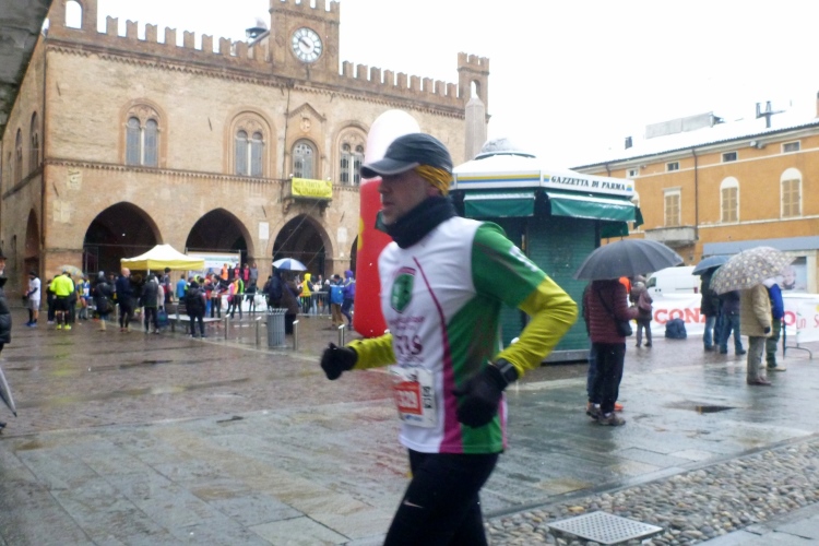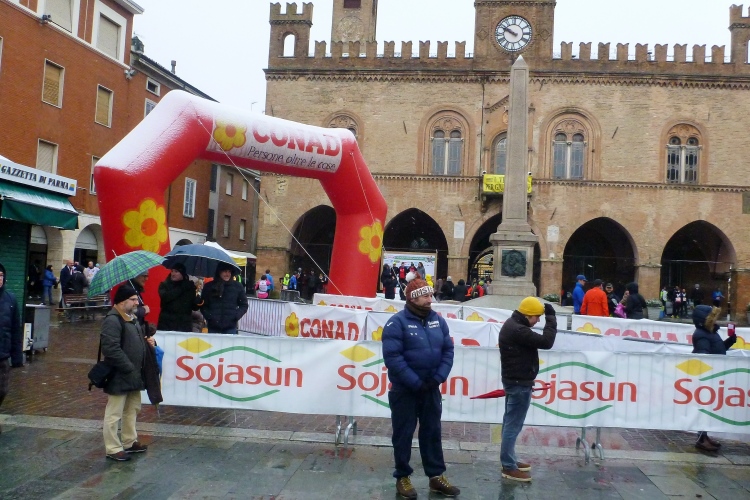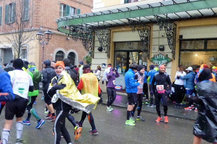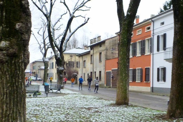 Emilia-Romagna, wer verbindet mit diesem Namen nicht die Badestrände an der Adria beidseits von Rimini? Sommer, Sonne und süßes Nichtstun. Nun ist aber noch Winter und diese Zeit bietet sich natürlich auch für den Marathon-Sport an. Normalerweise versprechen gemäßigte Temperaturen im Westen der Region ein schönes Laufevent. Auf der Webseite des Verdi-  Marathons werden die Start- und Zieltemperaturen der letzten 20 Austragungen genau aufgeführt. So um die 10 Grad plus sind immer drin. Also brechen Judith und ich wieder einmal zu einem Laufwochenende in Italien auf. Dumm nur, dass uns dieses Jahr die sibirische Kälte erwischen wird und  wir statt wunderschönen Sonnen-Impressionen eher triste Schneebilder mit nach Hause bringen. Davon sollte sich aber niemand abschrecken lassen.
