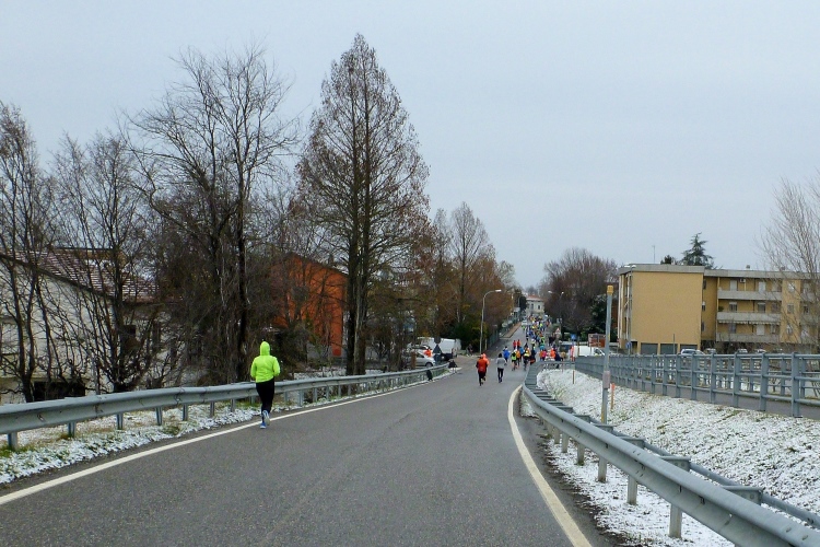 Keine Minute zu früh stehen wir am Start und sofort geht es los. Einige Zuschauer feuern uns hier an. Relativ schnell sind wir in lockerer Bebauung und nach zwei Kilometern haben wir Salso, wie man hier zu Salsomaggiore sagt, schon hinter uns gelassen. In Erinnerung ist mir der miserable Zustand der Hauptstraße geblieben. So viele Schlaglöcher und Teerflecken habe ich selten gesehen. Der Blick auf die weißen Hügel links und rechts heitert ein wenig auf. Und schneebedeckte Palmen sieht man sonst nur im Fernsehen. Bei Kilometer 4,5 überqueren wir den Torrente Ghiara. Der Sturzbach muss wohl zuweilen heftig anschwellen. Die Verbauung im Flussbett fällt auf. Erstmals bei Kilometer sechs werden wir an Verdis berühmte Musik herangeführt. Hunderte Meter weit stehen Lautsprecher, aus denen die Arien aus „Aida“, „Rigoletto“ und „Nabucco“ erklingen.