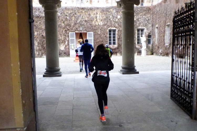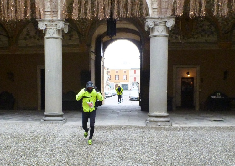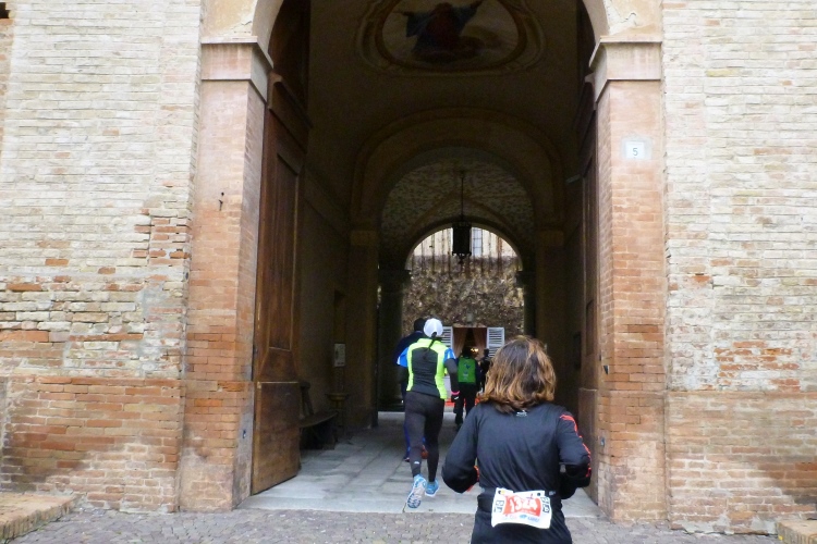 Das nächste Highlight steht bei ca. km 30 auf dem Programm. Es geht nach Soragna, eine Gemeinde mit 4.800 Einwohnern, von einem Langobarden mit dem Namen Liutprad 712 erstmalig erwähnt. Am Hauptplatz das Ziel der „Corsa del Principe“ („Lauf des Fürsten“).  Die Kilometerangaben entsprechen der Ausschreibung. Eine neoklassizistische Synagoge gibt es in Soragna für Nichtläufer zu bewundern. Am Schloss des italienischen Fürstengeschlechts Meli-Lupi entlang. Eine Dame versucht mit einer Sonntagstorte den Laufweg zu kreuzen. Appetit hätte ich schon.