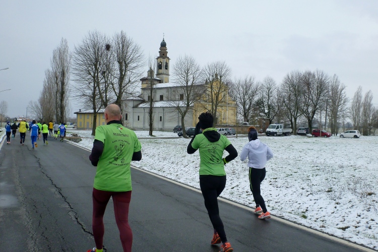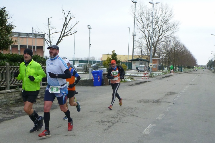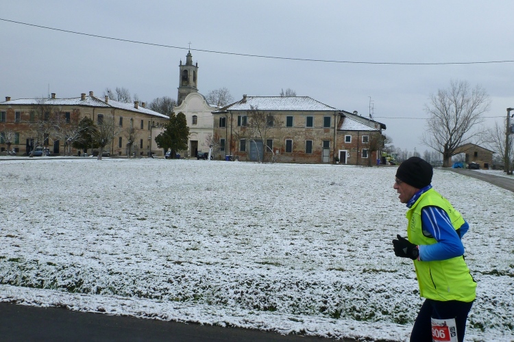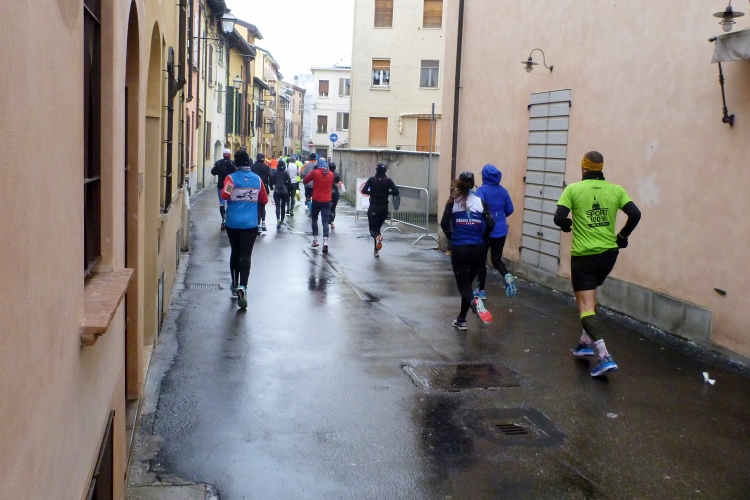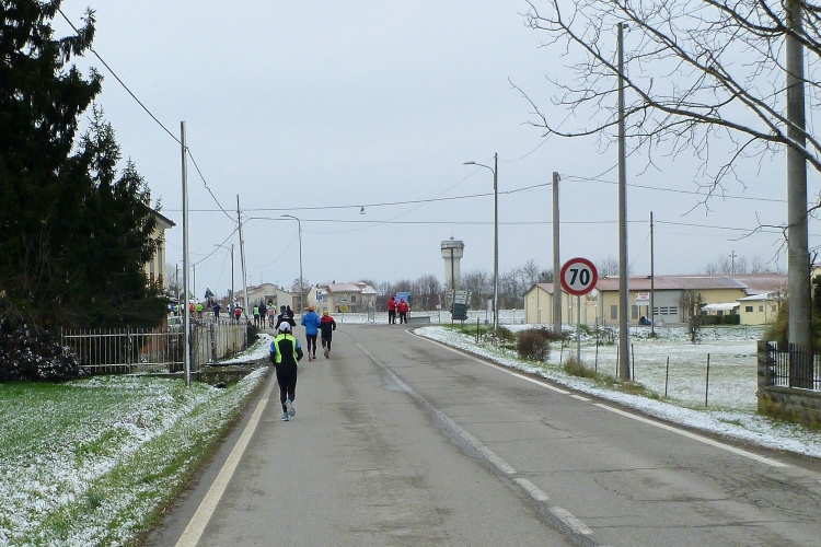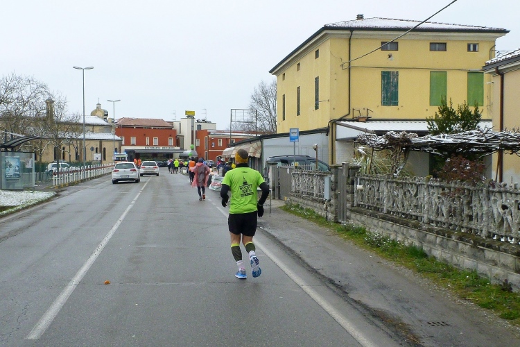 Weiter durch die Felder. Wer meint, in Deutschland gäbe es die meisten Straßen, der war noch nie in der Po-Ebene. Unendlich viele Helfer sichern die vielen kleinen Kreuzungen. Trotzdem wird man gelegentlich von Autos belästigt. Auf so einem schmalen Sträßchen ist das manchmal sehr störend. Zumal man nie weiß, wann einen die nächste Böe um einen Meter versetzt. Trotz allem bleibt es unterhaltsam. 600 Sportler sind unterwegs, so dass man immer andere Läufer im Blick behält. Ist ja auch nicht schwer auf dem tellerflachen Land. Einige große Hunde kann man in eingezäunten Gärten sehen. Die zweibeinigen Besitzer glänzen durch Abwesenheit.