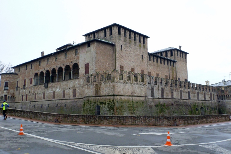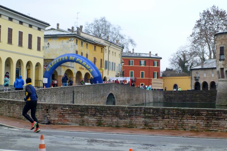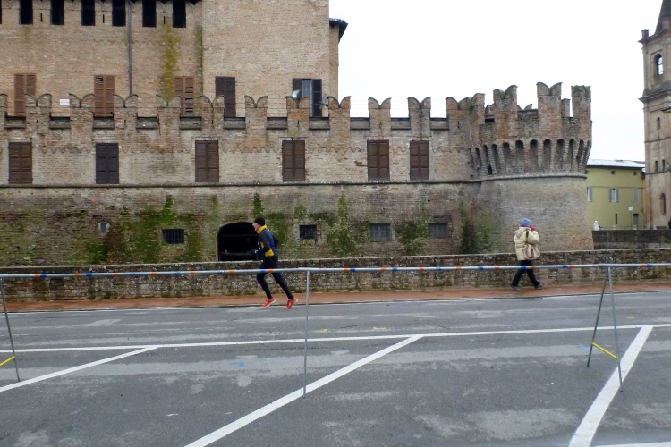 Für Läufer mit Kindern ist hier sicher das Labyrinth aus schnell wachsendem Bambus interessant. Franco Maria Ricci hat es nach dem Vorbild antiker römischer Mosaiken errichtet. Seit 2015 gibt es diese Anlage mit 3 Kilometern Irrwegen. Viele historische Gebäude verzeichnet das italienische Wikipedia. Die deutsche Version hält sich recht bedeckt. Sicher auch ein Zeichen dafür, dass diese Gegend für die deutschen Reisenden nicht von allergrößtem Interesse  ist. Für uns unübersehbar die Festung Sanvitale oder Castello di Fontanello aus dem 12. bis 16. Jahrhundert. Beeindruckend mit dem umgebenden Wassergraben. Hier trennen sich die 500 Halbmarathonis von uns und streben dem Ziel entgegen. Ich bin seit mehr als 2 Stunden unterwegs. Statistisch habe ich damit kaum Chancen, unter 4 Stunden zu bleiben.