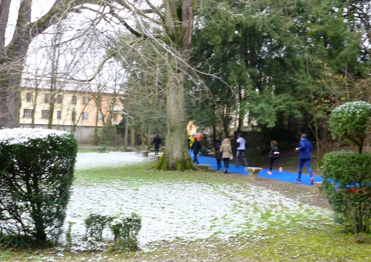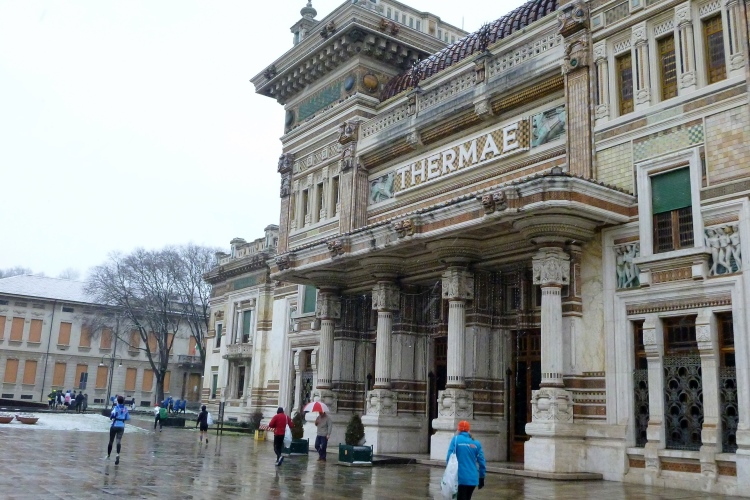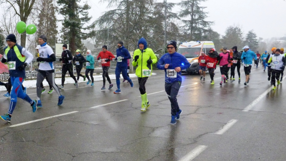 Der Start für alle Wettbewerbe (10 km „Salso-Fidenza“, Halbmarathon, „Corsa del Principe“ über 30 km und Marathon) findet um 9:00 Uhr auf Salsomaggiores Hauptflanierstraße Viale Giacomo Matteoti statt. Die Toilettenhäuschen stehen in einer Seitenstraße am Parco Giuseppe Mazzini etwas versteckt, weshalb sich die Wartezeit in Grenzen hält. Es lohnt sich auf jeden Fall, die genauen Pläne im Internet zu studieren. Gedruckte Informationen gibt es keine. Kurz vor der Taschenabgabe entscheide ich mich für eine vierte textile Lage. Der Wind ist zu eisig. Auch wenn mir eine trockene Jacke im Ziel dann sicher fehlen wird.