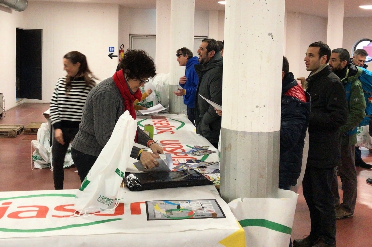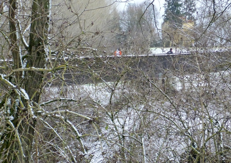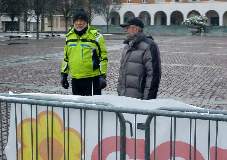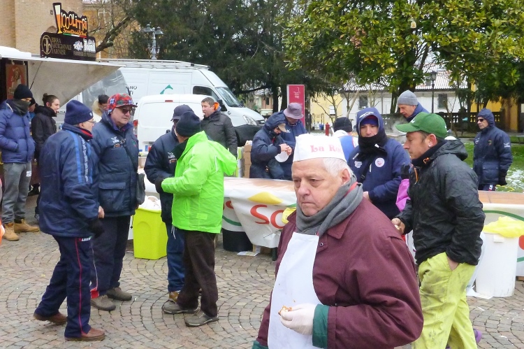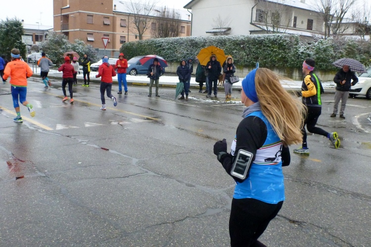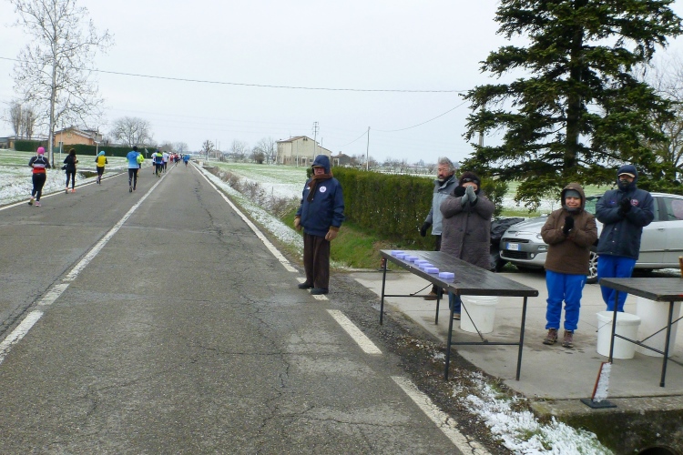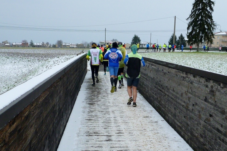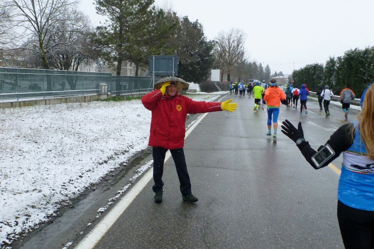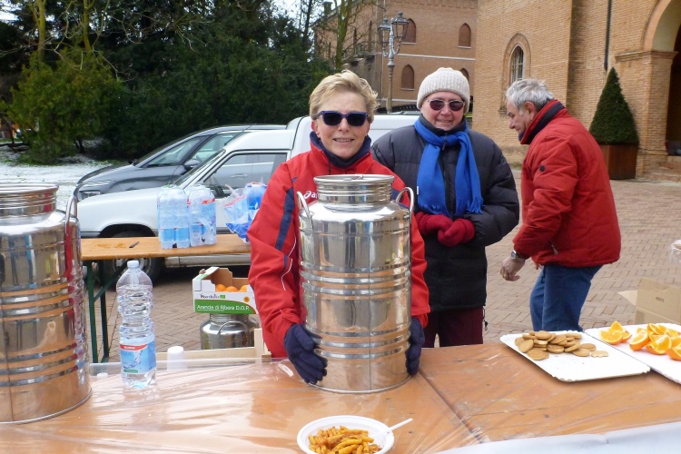 Das Personal an der Verpflegungsstelle bei km 10 ist sichtlich überlastet. Eine Schlange hat sich vor der Teeausgabe gebildet. Judith und ich laufen durstig weiter. Ein kurzes Stück über einen schmalen Feldweg führt zu einigen Rangeleien. 1.500 Sportler sind ja noch auf der Piste. Die idyllische Brücke über ein Bächlein ist eisglatt. In Parola geht es über die Via Partigiani d'Italia weiter. Fast hätte ich vergessen, die wenigen Schlachtenbummler zu fotografieren. Die sind dick verpackt und guter Dinge.