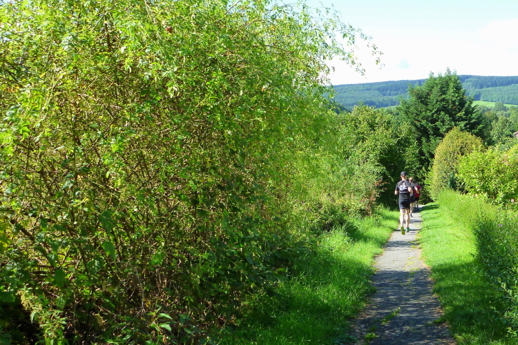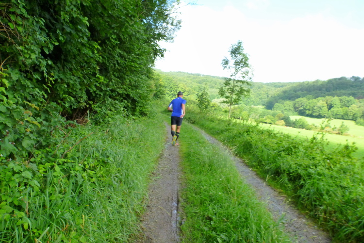 Der Kurs ist nun wieder gefällig, die vorher hart in der Sonne erarbeiteten Höhenmeter gibt es zurück. Bis zur Aschenhütte geht es hinunter und dann laufen wir an die Bundesstraße 64 heran, die in großen Bögen das Eggegebirge überwindet. Das bedeutet dann auch für uns nochmals eine kernige Steigung bei Kilometer 18/19. Alle gehen, ich auch - notgedrungen. Der Kurs fordert meine letzten Reserven.