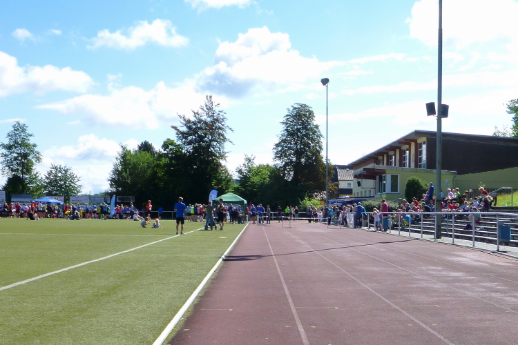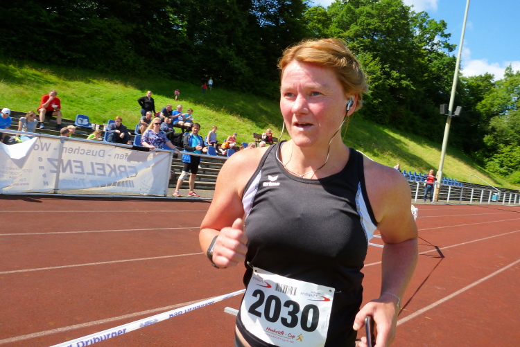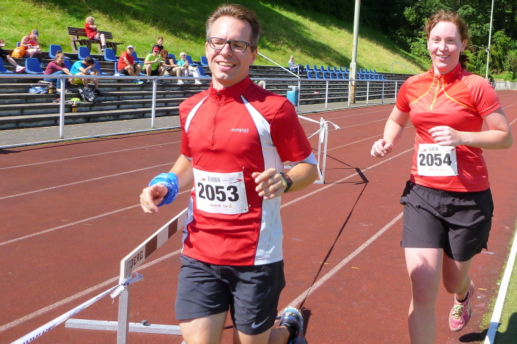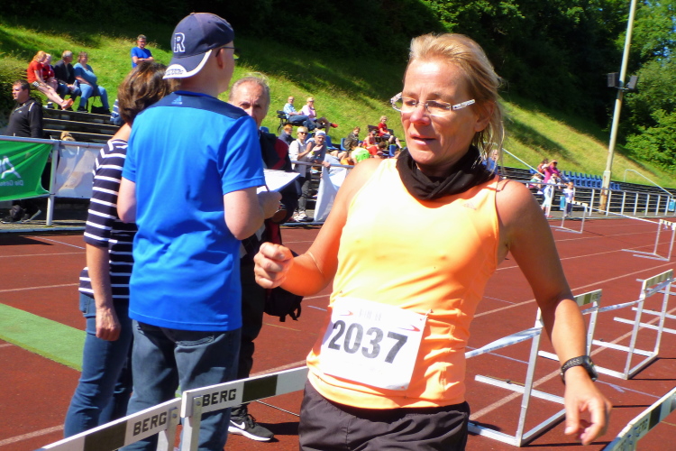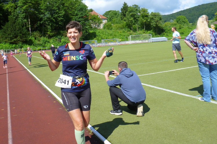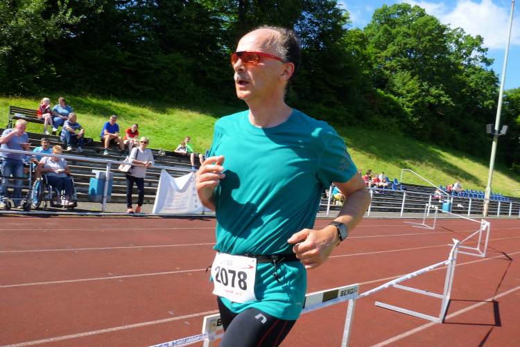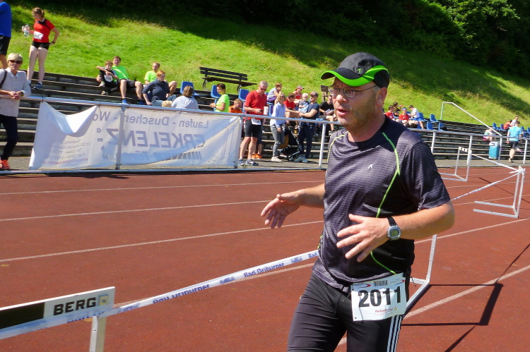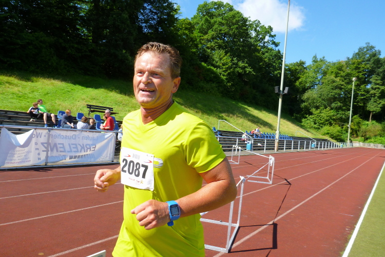 Auf einem Kilometer geht es nun steil hinunter, wir hören bereits die Moderation vom Zieleinlauf. Den letzten Kilometer laufen wir wie zu Beginn, dann folgt noch eine knackige Steigung die Jahnstraße hoch und bevor wir die Runde im Stadion drehen müssen wir zwei letzte Stufen im Sportgelände erklimmen. Nach 1.54 Stunden bin ich im Ziel, bin damit hochzufrieden. Ich habe mit mehr gerechnet.