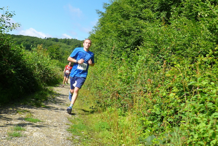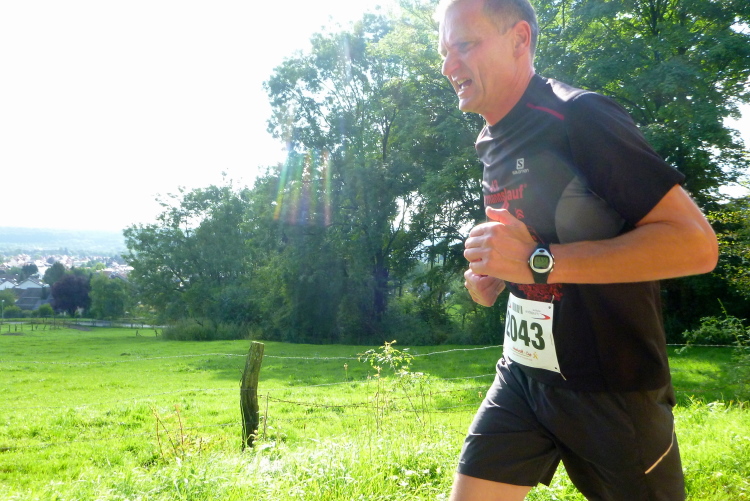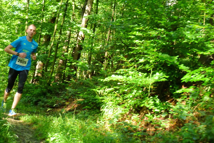 Bei Kilometer 2,5 (kurz nach der Wende des 4,5 Kilometer-Laufes) haben wir bereits 100 positive Höhenmeter geschafft. Beim Blick nach rechts durch die Bäume bietet sich ein eindrucksvoller Blick auf das tiefer liegende Bad Driburg. Diese Aussicht werden wir im Fortgang des Rennens noch mehrmals haben, und dann immer aus einer anderen Richtung. Die Strecke wird schmäler, teilweise könnte man hier nur hintereinander laufen, und immer wieder erfordert der Untergrund wegen der Wurzeln, Steine und dem Morast allerhöchste Konzentration. Der Wechsel zwischen Sonne und Schatten kommt da noch hinzu und macht so ganz nebenbei eine einigermaßen akzeptable Fotoarbeit unmöglich. Ich bitte um Verständnis.