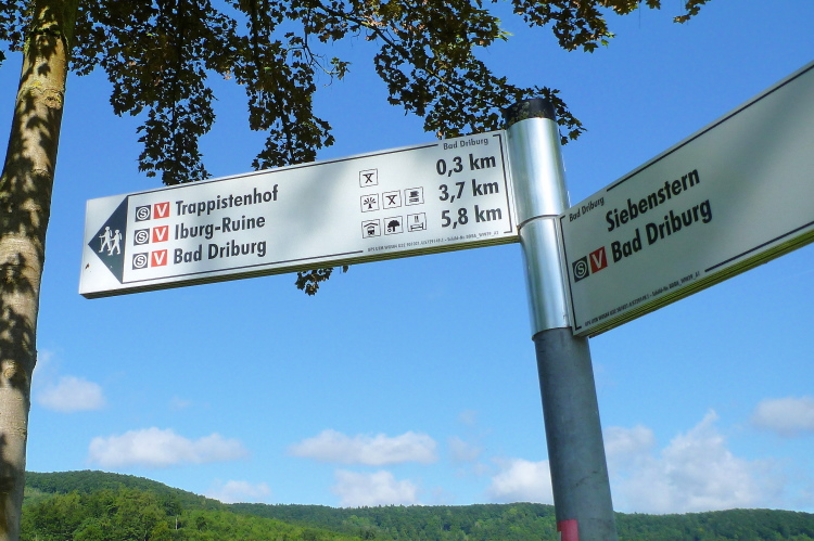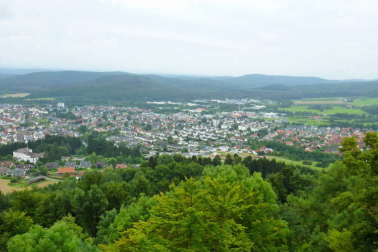 Den höchsten Punkt mit 332 Metern erreichen wir im Bereich der Iburg. Ich hätte da noch die paar Meterchen (50 Höhenmeter) eingebaut und eine Schleife zur Sachsenklause und zur Ruine Iburg laufen lassen. Die frühere Höhenburg steht auf einem Bergsporn oberhalb der Stadt. Unweit davon steht der Kaiser-Karls-Turm, den man auch besteigen kann. Von oben hat man eine weite Aussicht, u. a. auf den Solling und das Lipper Bergland.