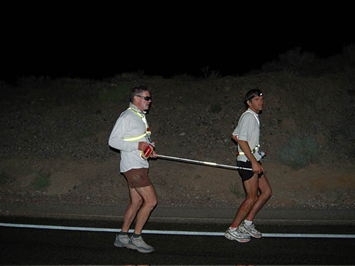 Unmittelbar nach dem Sonnenaufgang bringt mir Günter schon das erste mit Eiswasser getränkte Handtuch und legt es mir über die Schulter. „Warum jetzt schon? Es ist doch noch gar nicht so schrecklich heiß…“. Günter: “Du musst schon gleich zu Beginn kühlen, damit die Körpertemperatur nicht überschwappt!“ O.k., ich glaube es und vertraue ihm, da er vergangenes Jahr als Läufer es auch so gehandhabt hat und gut und schnell durchs Rennen gekommen ist.