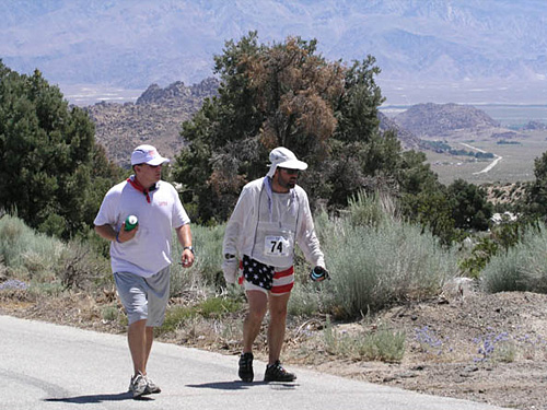 Vorgestern waren wir noch dort beim Bergwandern und konnten von dieser Perspektive sowohl das Ziel, Sierra Nevada mit Mt. Whitney, sowie andere schneebedeckte Berge in 160 km Entfernung und unter Hitze flimmender Luft in ca. 60 km Entfernung den Startplatz, die Badwater-Salzpfanne, tief unter dem Meeresspiegel ausmachen.