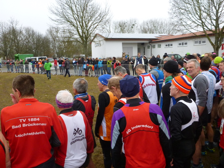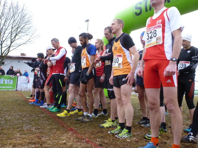 Ich schaue bei meinem Einlaufen nicht auf die Uhr und kriege gerade noch mit, dass bis zu unserem Start, alle Männer ab der Altersklasse M50, noch zwei Minuten verbleiben. Das sorgt für ein kurzes Hochjagen meines Pulses. Ich gehe von hinten in das Starterfeld hinein. Mein Freund Albert Walter ruft mir noch zu: „Jetzt aber flott!“ Ich werfe die Laufjacke auf die Seite. Eine Kamera brauche ich bei einem Meisterschaftslauf nicht mitführen, man würde mich dann vielleicht für vollends verrückt erklären. Gut, dass ich die Startnummer schon vorschriftsgemäß angepinnt habe, Bänder sind ja bei Meisterschaften verboten. Du musst die Nummer mit vier Nadeln am der Trikotvorderseite in Brusthöhe anbringen. Vor einigen Jahren habe ich mir da noch einen Rüffel eingehandelt. Ich hatte die Ecken der Startnummer umgebogen, damit die Nadeln nicht ausreißen. Auch das war damals nicht erlaubt. Und dann muss ich ran. Meine Vorbereitung war nicht gerade top, denn ein Winterlauf in meiner Gegend sowie die Oberbayerischen Crossmeisterschaften in Pfaffenhofen genügten. Ich bin skeptisch. Nicht Letzter werden, das ist mein Minimalziel.