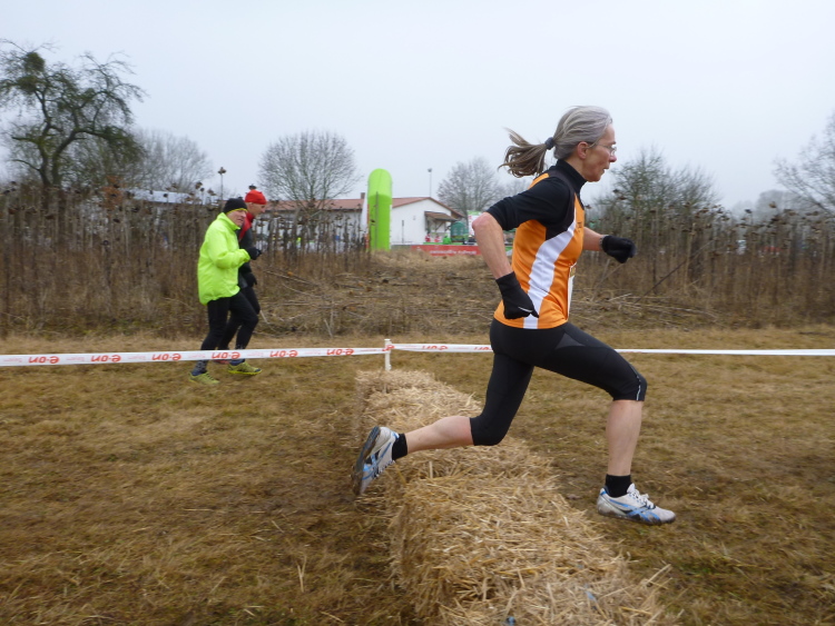 Nach 200 langen und schnellen Metern geht es auf den Mainwiesen zurück, ruppiger als zuvor. Und es sind einige kleinere Senken darunter, die jeden aus den Rhythmus bringen. Ja, das ist Cross, keine Chance für Eintönigkeit, du musst immer höchst konzentriert sein. Ein falscher Schritt und es geht dahin. Wir rennen um eine Baumgruppe herum, kurvig geht es zur Sache, doch der Kurs ist trotzdem schnell. Dann nähern wir uns wieder dem Zielgelände. Das Spitzenfeld ist längst in die zweite Runde eingebogen. Parallel zum Ziel haben die Kemmerner noch ein Strohhindernis eingebaut. Die einen steigen auf die Strohbüschel, während die anderen elegant drüber hüpfen. Ich mache zwar auch einen Hupfer, doch sportlich schaut wohl anders aus. Deshalb hat sich Laufsportspezialist Norbert Wilhelmi mit seiner Kamera auf den Bauch gelegt und bannt die ungraziöse Springerei auf seinen Chip. Meine M4Y-Kollegen werden kräftig ablästern, wenn sie die Bilder sehen. Aber ich kann sie ja mal zu einem Cross einladen.