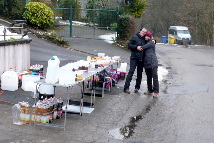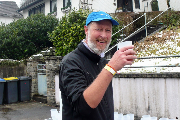 Im Trupp, so 7-7:30er Schnitt, erreichen wir die erste VP kurz vor der Müngstener Brücke. Die Schlacht am kalten Buffet bricht los. Genau wie von Reinhard Mey besungen. Ein weiterer Hochgenuss. Aber alles ist reichlich da. Warmer Tee geht nur so weg. Wir kommen wieder.