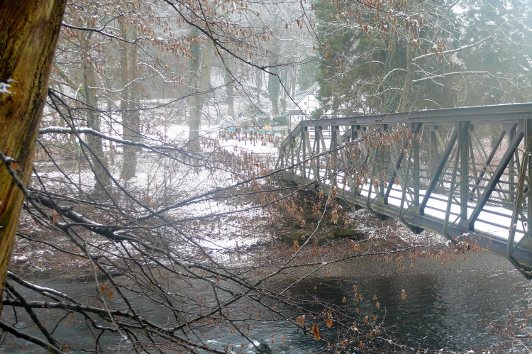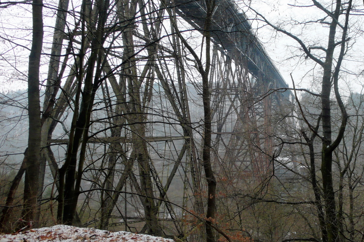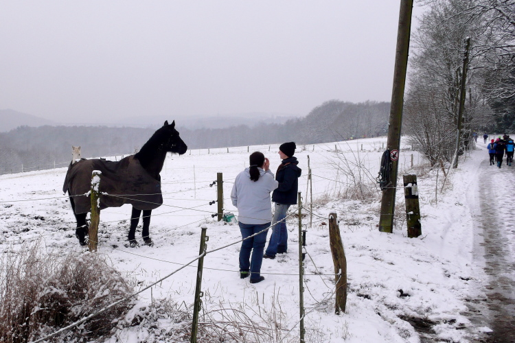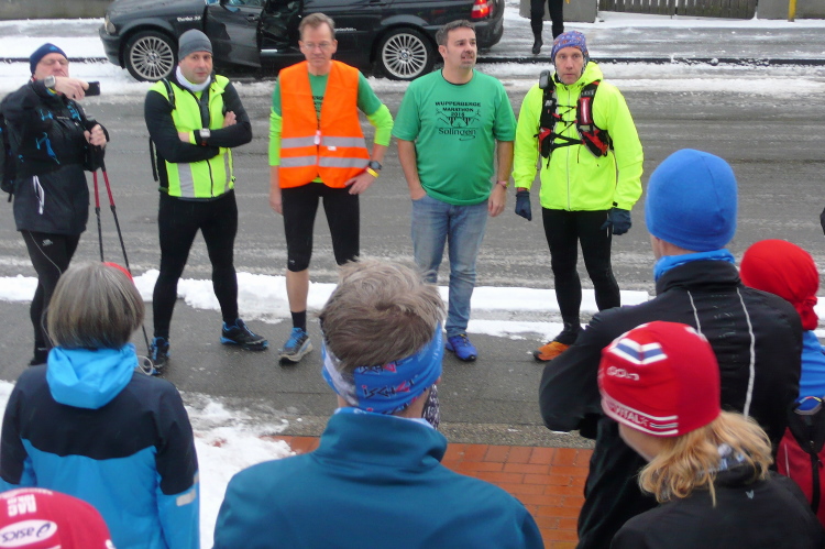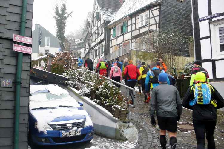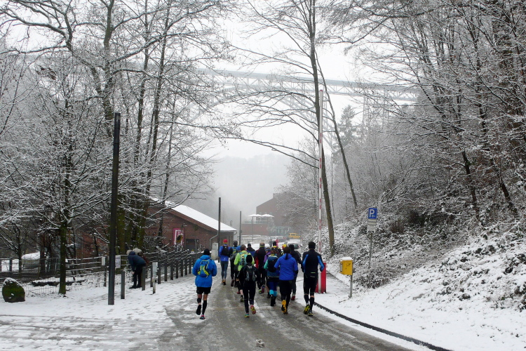 Es ist kalt und wir traben los. Im Schnee und Matsch kann man den Fußspuren gut folgen, eine Serpentine auf weichem Waldboden bringt uns auf die Höhe, eine Straße nach Karlsruhe. Nochmal durch Wald, eine Hauptstraße überquert, und schon tauchen wir wieder in den Wald an der Müngstener Brücke ein. Der Schotterweg führt oben am Hang entlang. Gute Aussicht von hier. Man kann sogar den Weg von heute früh sehen. Unter der imposanten Brücke durch. Ein Netztunnel. Man baut. Und nun- man will es ja nicht glauben- an Seilsicherung nach unten. Steil. Rutschig. Danke fürs Seil, Oli! Am vorletzten VP gibt’s noch mal alles, diesmal ohne Schlacht. Wir sind müde und wenig kampfeslustig, außerdem gibt’s alles reichlich.
