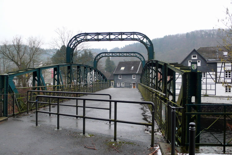 Gerade ausgetrunken und fast den Mund verbrüht, starten die schnellen Maras. Schnitt 6-6:30 haben sie angepeilt. Ich sehe sie zum letzten Mal. Dann wir langsameren. Henning mahnt zur Eile, denn auskühlen ist schlecht, so nass geschwitzt, wir nun sind. Hinter der Kurve das Baudenkmal. Die Brücke. Ein Superlativ, Toll. Immer noch in Reparatur, man tut auch heute was, Baugeräusche sind zu hören. Ein guter, welliger Weg führt uns durchs Wupper-Tal. Über eine schöne, alte Eisenbrücke rüber aufs andere Ufer, nun auf Asphalt. Bis zum Schloss Burg. Die Seilbahn steht still, also die Schlossbergstraße hoch und in die Serpentinen hinein. Grinsende Gesichter von oben.
