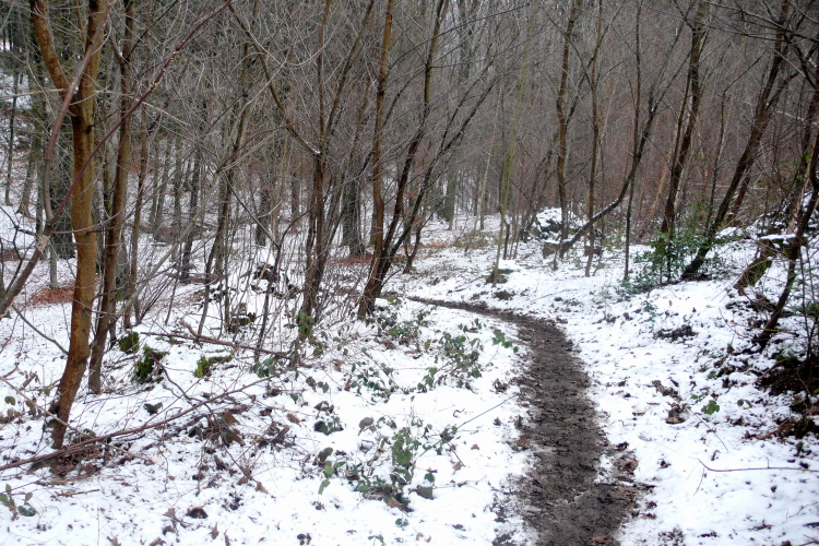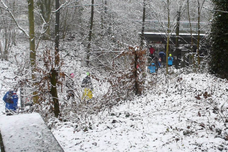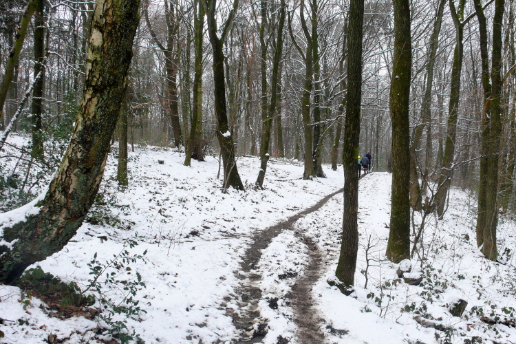Pünktlich nach kurzem Briefing geht es um 10 los. Über den Glitsch auf den Straßen in den Wald. Kaum kommen die Bäume, reihen wir uns zur Polonaise ein. Steil. Glitschig. Kalt. Und superschön.
