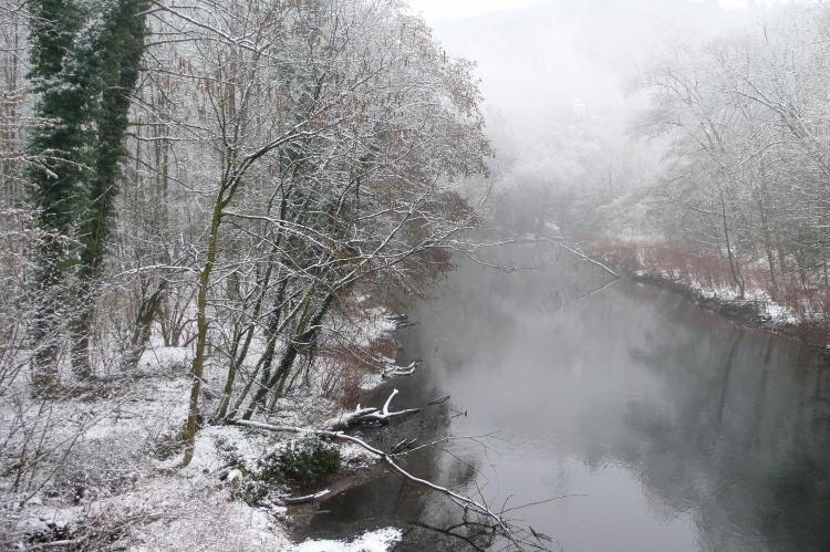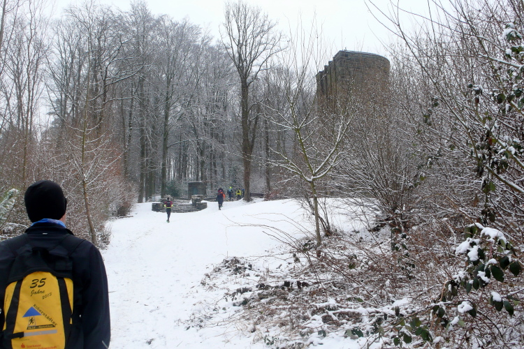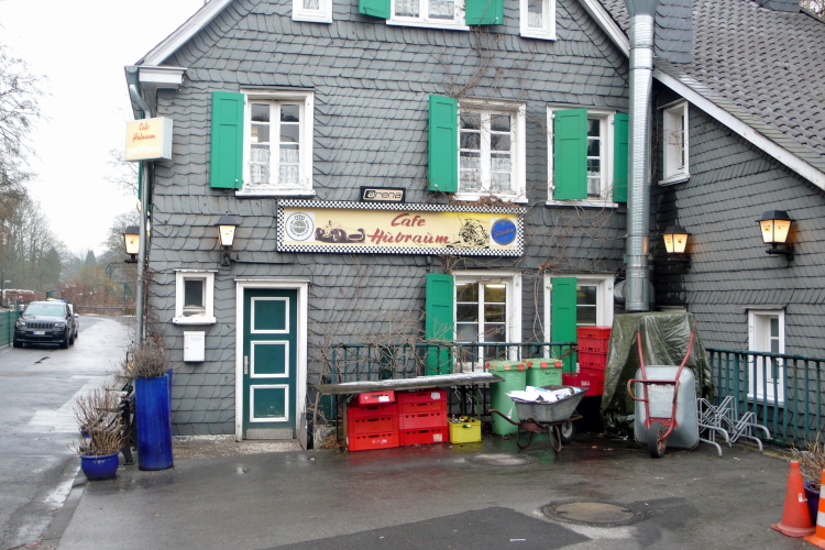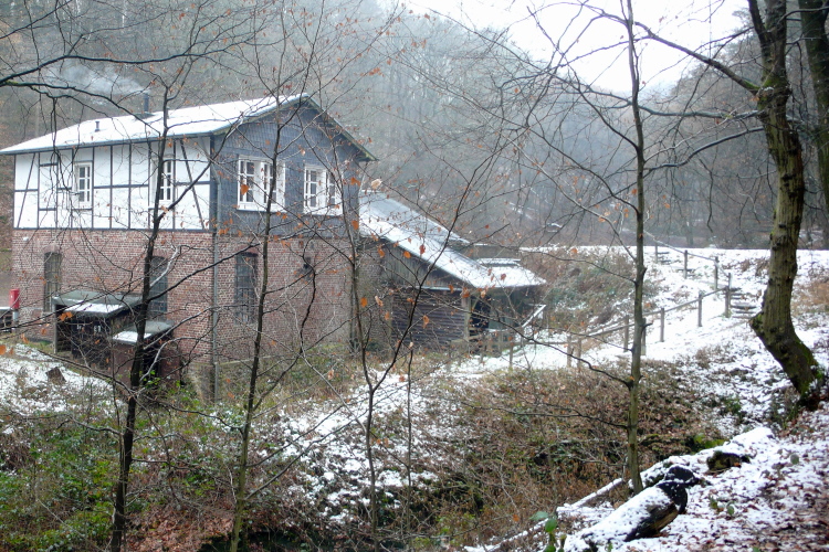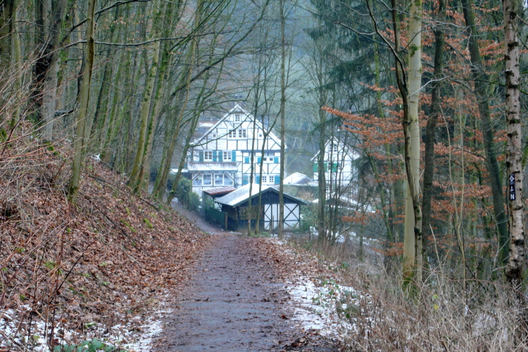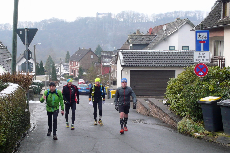 Endlich unten im Tal. Cafe Hubraum ist zwar offen, aber die Biker fehlen. Auch das Straßenbahnmuseum liegt still. Hier könnte man ohne Mühe nach Cronenberg fahren. Im Sommer. Ich glaube ich weiß jetzt, warum Oli uns im Winter hier herschickt. Der letzte Anstieg. Bis zum Ziel geht’s hoch. Mal steil, mal steiler. Aber immer bergbauhistorisch. In diesem Tal hat es Eisenherstellung gegeben und so manches Relikt zeugt noch deutlich davon. Hinweistafeln erklären viel. Die schnellen Läufer kriegen so was ja kaum mit, aber ein langsamer Knochen wie ich hat noch die Muße dafür.