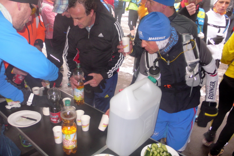Am VP sind hundert Halb-Maras und warten auf uns. Aber nur auf die Schnellen, plötzlich traben sie ab und sind weg. Wir versorgen uns gut. Ich traue meinen Augen kaum: Salz! Zum Essen, nicht zum Wegbestreuen. Und lerne: Banane mit Salz, heißer Tee hinterher...und schon klappt das klare Denken wieder besser!