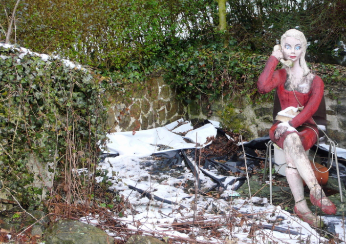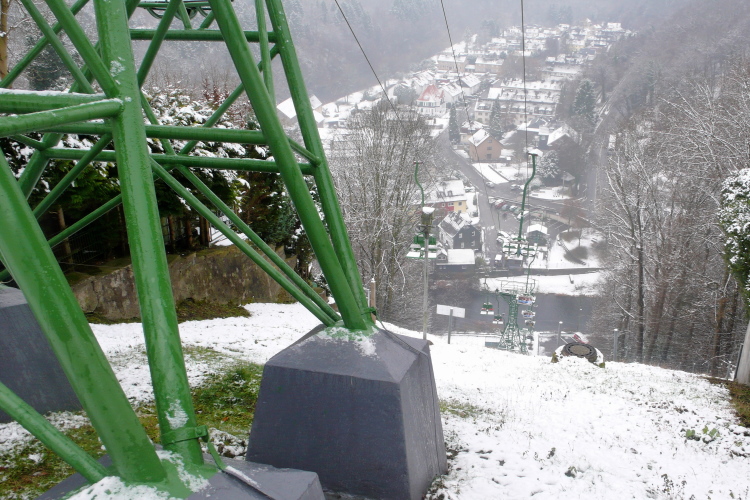 Kompliziert wird‘s jetzt- über die Wupper, eine Straßenunterführung, dann hoch, über die Wupper, eine Ampel und auf einem Radweg hoch zur Bergbahntrasse. Eine Steigung, leicht nur, aber lästig. Immer muss ich ausruhen. Hier ist der Schnee nun weggeschmolzen und gibt Olis rosa Pfeile frei. Kann man sich drüber freuen oder auch nicht, denn heimtückisch führen sie auf steile Felsen hoch und wieder runter. Die Trasse haben sie damals in den Fels gekerbt und diese Klippen sind was für Oli...
