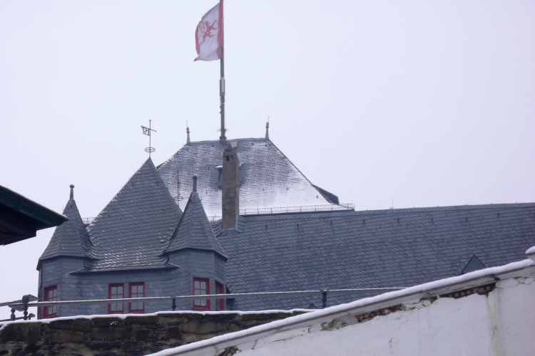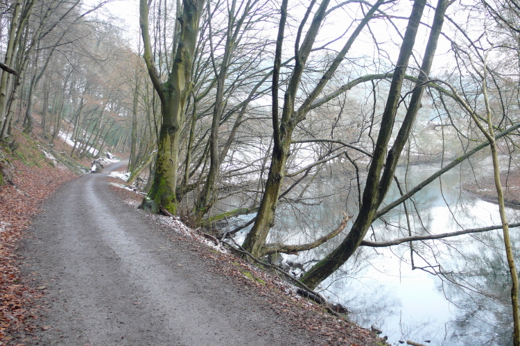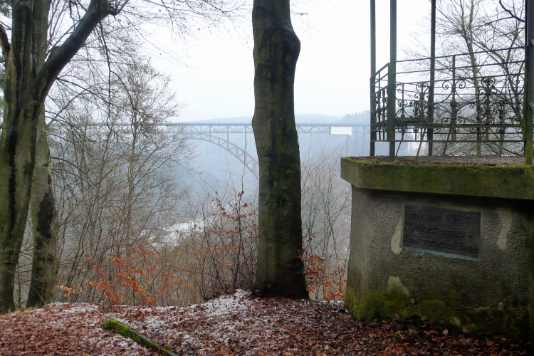 Bei Schönwetter - jawohl, gibt’s hier auch oft- toller Blick ins Tal, nur heute gerade nicht. Mein Akku streikt, mag die Kälte nicht, Henning läuft weiter, Akkuwechsel im Flug, manches Motiv futsch, so läuft‘s halt eben. Am Berg gegenüber, am Kriegerdenkmal, geht wieder alles. Begeisterung unter den Läufern, ein Kamerad plant bereits einen kleinen Urlaub mit der Familie hier, aber es ist ja auch wirklich schön. Oben ein Stück Straße (Höhweg-sic) und wieder in den Wald. Eine Talsperre. Über die Mauerkrone rüber und wieder hoch. Guter, breiter Schotterweg, bis zum bitteren Ende.