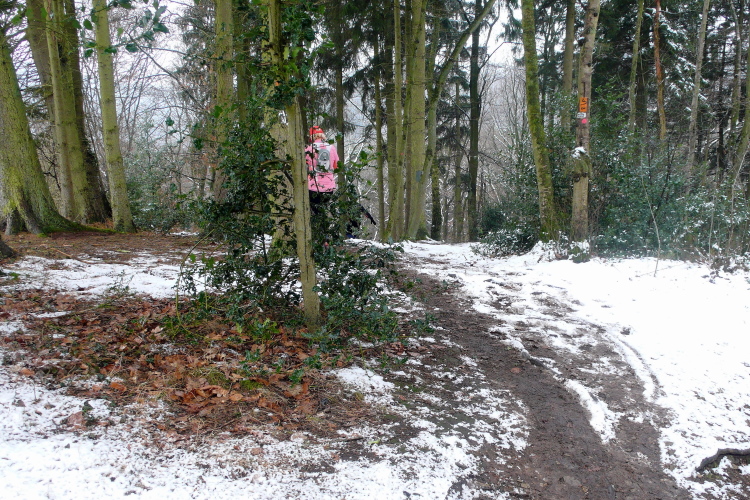 Letzter Abschnitt. Erstmal wieder schön hoch. Auf Trails natürlich. Oben wird’s nun knifflig. Rosa Pfeile – manchmal. Fußspuren – ohne Schnee schwierig. Niemand da zum Fragen. Also Wege antesten. Und tatsächlich, ich bin richtig, ein Pfeil. Nun schön runter, ein guter Weg bis zur Bake. Der Holzfäller stoppt mich. Tiiimbeer! - und der Baum fällt. Natürlich quer über den Weg. War ja klar.