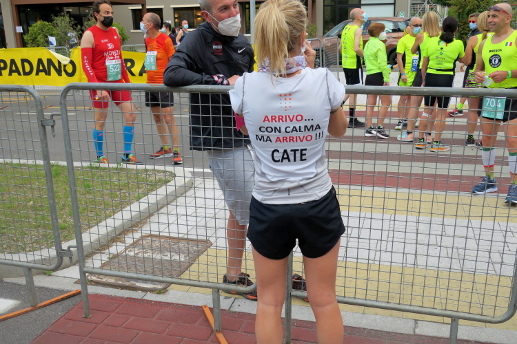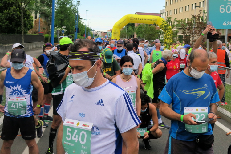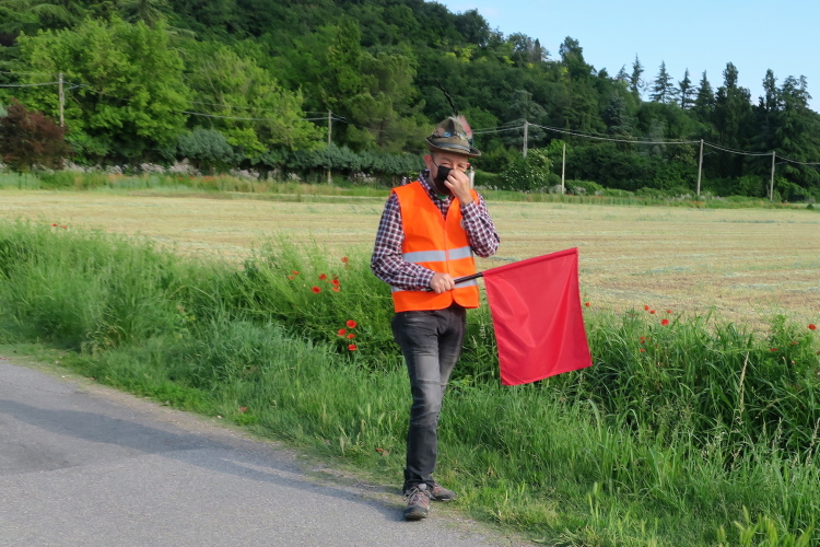 Ich hatte gestern meine unterschriebene Erklärung dabei, dass ich in den letzten Tagen nicht krank war. Die wäre aber erst heute mitzubringen und abzugeben. Zum Glück rechnen die Veranstalter damit, dass jemand diesen Nachweis nicht mit hat. Leere Formblätter auf Italienisch stehen bereit. Jetzt ist auch bei mir alles komplett, tutto e completo. Das Startareal liegt einige 100 m gegenüber dem eingezäunten Bereich, wo gestern die Startnummern verteilt wurden. Im bin im 4. Block zugeteilt, der als Letzter jeweils in 5-Minuten-Abständen drankommen wird.