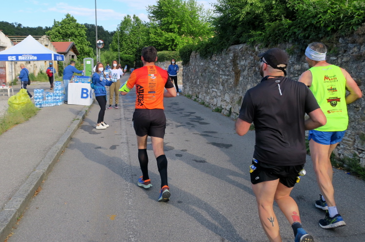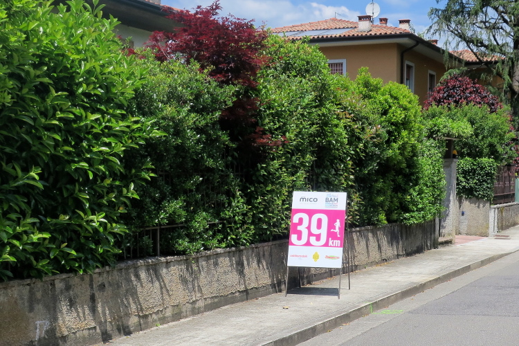 Mir fällt auf, dass bisher der Kurs fast auf einer Ebene kontinuierlich leicht aufwärts geht. Rund um Brescia gibt es Berge und Hügel, von einem flachen Marathon kann heute nicht die Rede sein. Der Wetterbericht hat 25+ Grad angesagt, gestern hatte es am Nachmittag 28 Grad. Der frühe Start um 7 Uhr ist bestimmt kein Nachteil. 11 Kilometer sind erreicht, das linke Knie macht sich nicht bemerkbar, meine orthopädischen Probleme sind vergessen. Es ist ein schöner Landschaftslauf, Francesa bleibt vor mir stehen, um einen überfahrenen Falken, der inzwischen von Autoreifen platt gedrückt ist, zu bemitleiden. Aber nach der Labe ziehen die beiden plötzlich an. Hinter mir sind noch einige Nachzügler von den Supermaratonetis, freue mich auf das Zusammentreffen vielleicht erst am Domplatz.