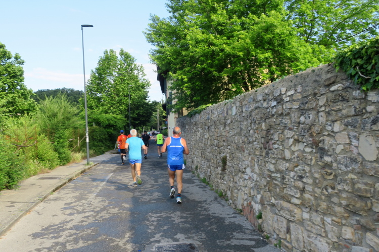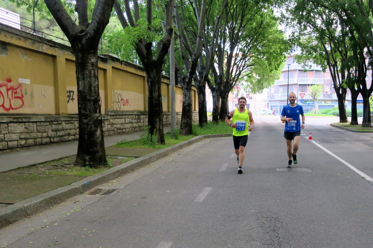 Jetzt geht es über die Tangentiale, ein kleiner Brückenanstieg steht bevor, die Halbmarathonläufer zweigen nach der Versorgung nach links ab, für die Marathonis geht es gerade weiter. An den Labestellen wurde bisher nur Wasser in Flaschen angeboten, bei normalen Marathons in Italien kann man sich sattessen. Ich komme mit Francesa und Luigi ins Gespräch – sie scherzt, dass Luigi Streifenpolizist ist und immer Autofahrer wegen Schnellfahrens „aufschreibt“, heute krebst er im Schneckentempo dahin und die Langsamfahrer müssten ihn zur Rede stellen. „Der Schmäh rennt“, wie wir in Wien sagen.