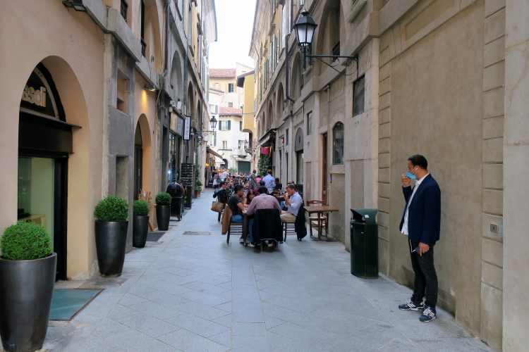 Es gibt in Brescia, mit ca. 200.000 Einwohnern Hauptstadt der gleichnamigen Provinz und nach Mailand zweitgrößte Stadt der Lombardei, einen eigenen Touristenpfad, der im Zentrum zu den wichtigsten historischen Stätten hinführt. Wo in Vor-Coronazeiten Tausende unterwegs waren, sieht man jetzt fast nur Einheimische. Aber zu meiner Überraschung sind die Plätze im Außenbereich der Restaurants schon am späten Nachmittag gut gefüllt.