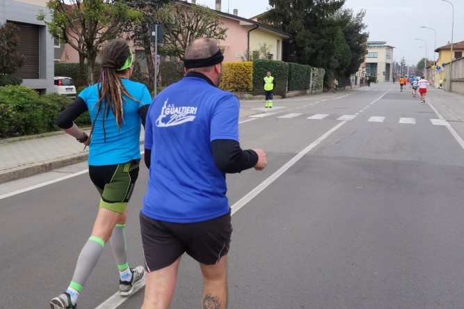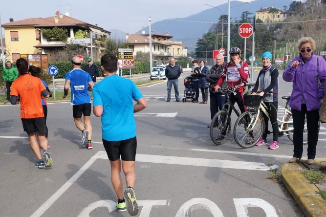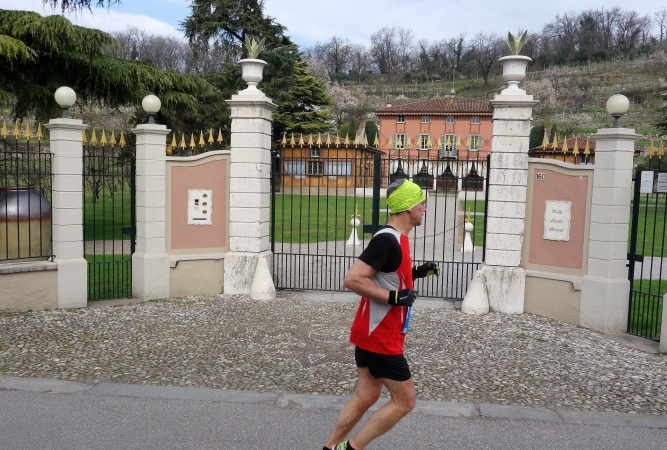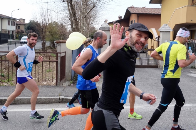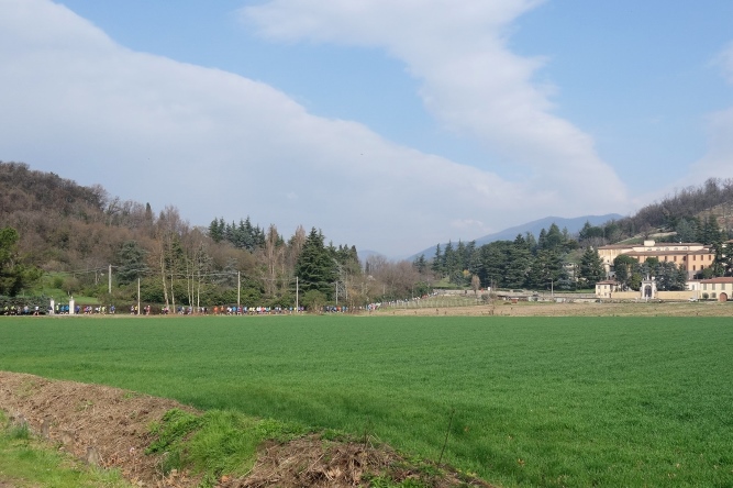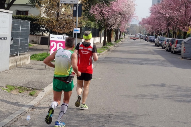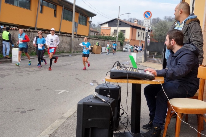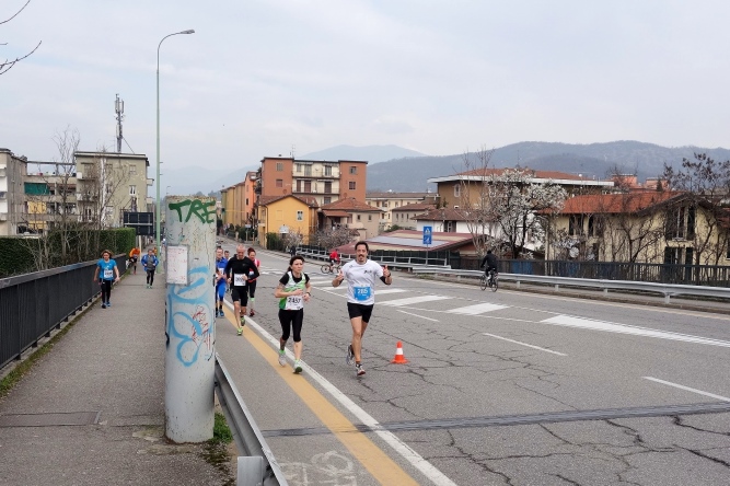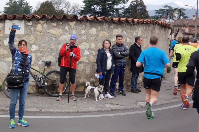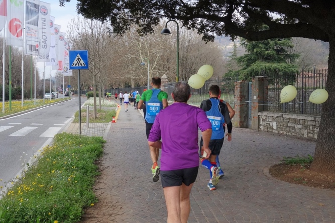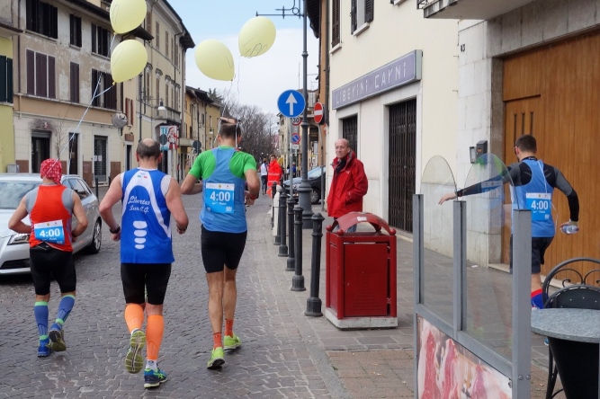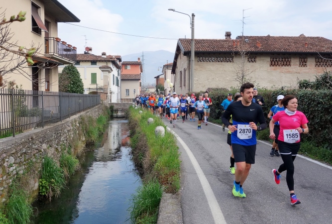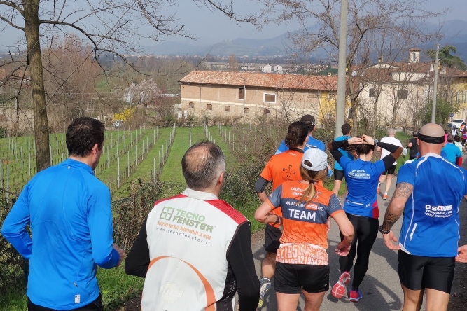 Nach dem kurzen Schock laufen wir in den nächsten Stunden in einer großen Schleife links herum durch die Vororte, bevor wir das Ziel im Zentrum erreichen werden. Abwechslungsreich geht es gleich auf ein Sträßlein durch einen malerischen Dorfkern, Gedränge inklusive. Bei km 3 wartet eine Band mit Line-Dance-Girls auf uns. Das folgende Museo del Ferro (Eisenmuseum), an einem romantischen Bächlein gelegen, lässt ahnen, dass wir in einem wichtigen Industriegebiet Italiens sind – obwohl hier alles wunderschön grün ist. Die ganze Laufstrecke werden wir von Kirschblüten in sämtlichen Weiß- und Rottönen begleitet. Naja, Mandelblüten sind auch dabei. Das Tempo ist anspruchsvoll. Die Zehner reißen uns mit. Für italienische Verhältnisse sind viele Zuschauer an der Strecke. Das Wetter mit Sonnenschein macht es ihnen leicht, uns zuzusehen. Mit Anfeuerungen wird jedoch gespart. Ein Klatschen ist zurzeit das höchste der Gefühle.