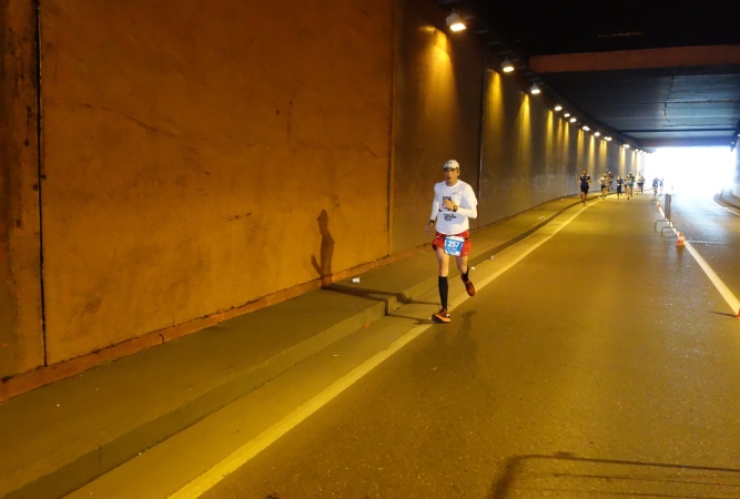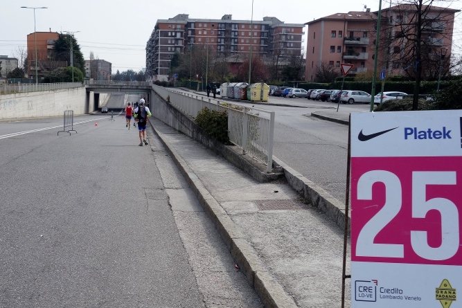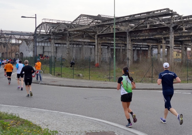 Zwischen verfallenen Werkshallen hindurch laufen wir auf ein nagelneues Hochhaus beim Einkaufszentrum zu. Die Trennung von den Halbmarathonis steht an. Jetzt wird es also einsamer. Hinter einer längeren Unterführung warten schon die nächsten Musikanten. Wir sind jetzt im Südwesten und dürfen mal hören, wie stark eine Glasschutzwand den Lärm von Autobahn und Tangenziale abhält. Beim Durchqueren mehrerer Fußgängertunnel fällt mir auf, dass die Strecke wirklich gut gesichert ist. Überall achten Helfer darauf, dass niemand vom rechten Weg abkommt.