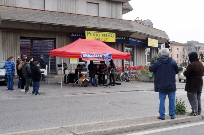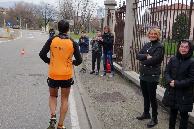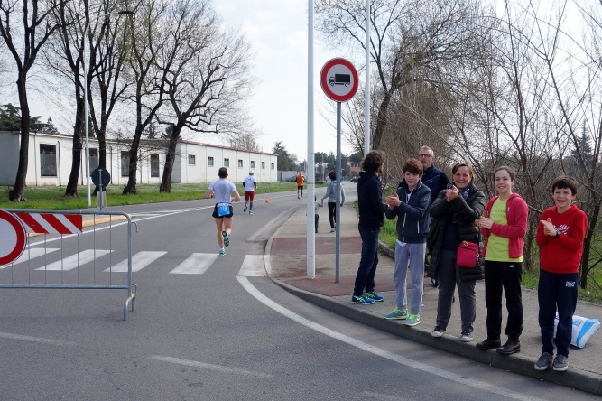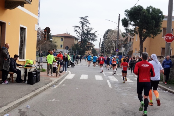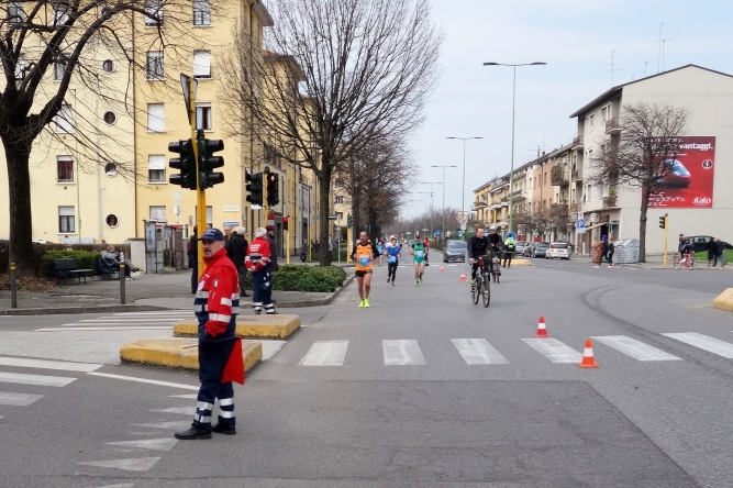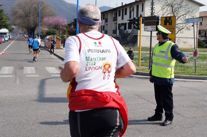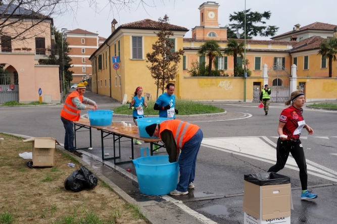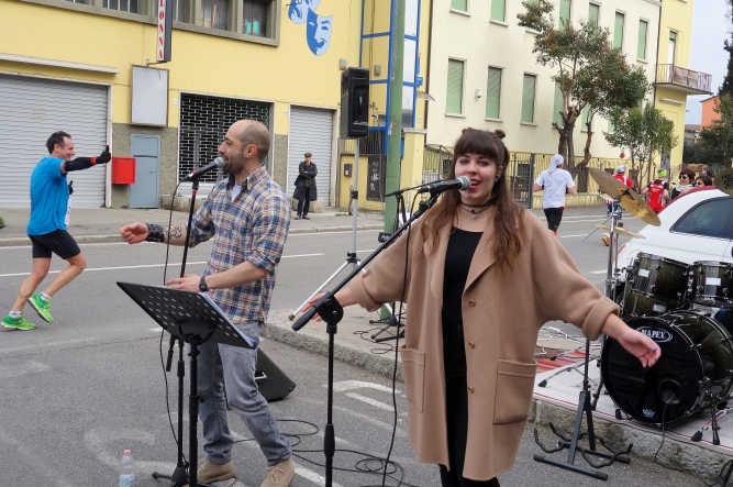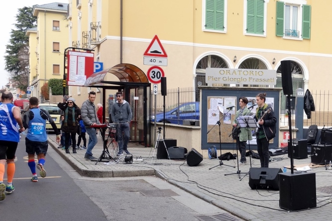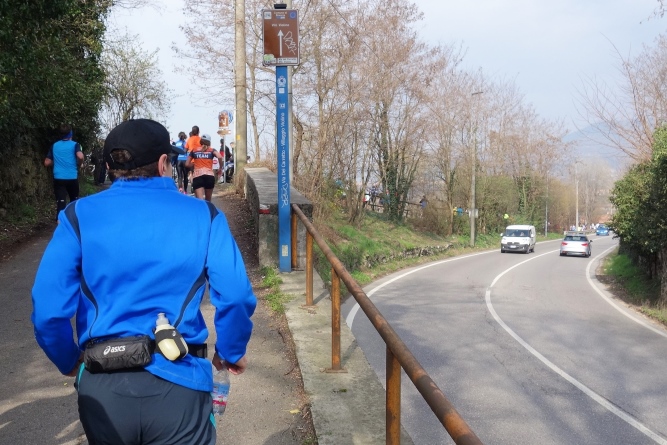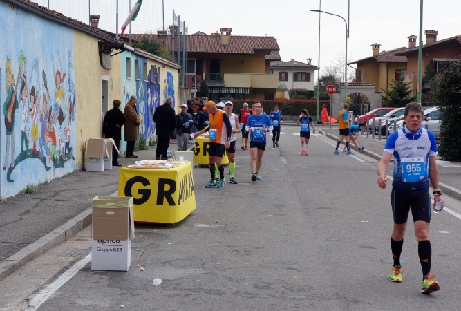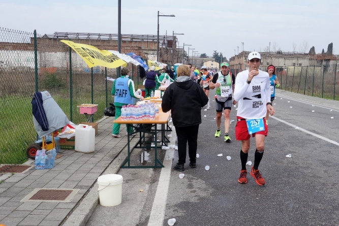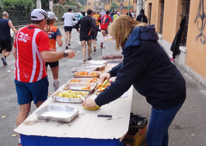 Die Verpflegungsstellen alle 5 Kilometer sind italientypisch ausgestattet: Wasser, Iso, warmer Tee, Bananen, Orangen, Kekse, Zucker. Dazwischen Schwammstationen. Toilettenhäuschen sehe ich auch noch einige. Außerdem stehen ziemlich viele Busse für den Rücktransport zur Verfügung. In der Via Cucca gibt es dann mal richtig laute Discomusik. Das verleiht Flügel. Der Linienbus 16 fährt nach Violino – Geigen werden wir bei aller Kunstsinnigkeit heute aber nicht zu hören bekommen. Dafür einen guten Kilometer weiter schon die nächste Band, diesmal auch mit vielen Zuschauern.