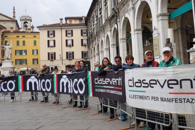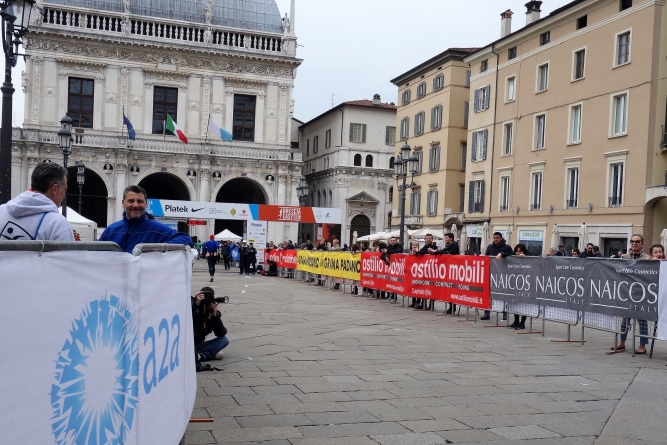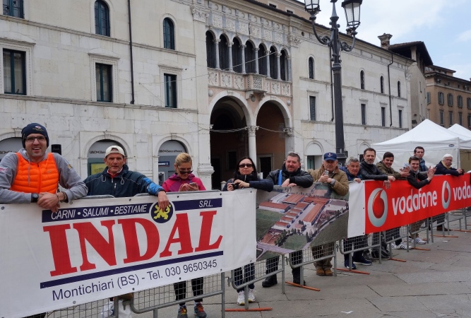 Relativ früh müssen wir am Sonntag aufstehen, um nach einem kleinen Frühstück den Fußweg zur Metrostation anzutreten. Seit 2013 gibt es die 14 Kilometer lange Bahnstrecke. Der führerlose Zug bringt uns mit vielen anderen Sportlern in den Norden der Stadt. Dank Steve und Bernie, die sich ortskundig gemacht haben, steigen wir nicht mit allen italienischen Sportlern aus, sondern fahren bis zur Station Mompiano, wo punktgenau die Kleideraufbewahrungs-LKW stehen. Einige Minuten später trifft der Tross der ehemaligen Mitreisenden nach einem Spaziergang auch ein. Da haben mich die Briten mit ihrer akkuraten Vorbereitung mal wieder beeindruckt.