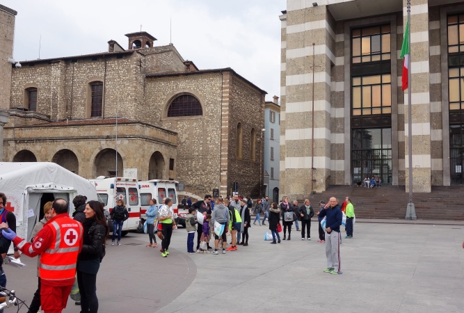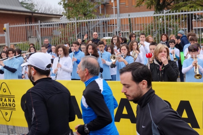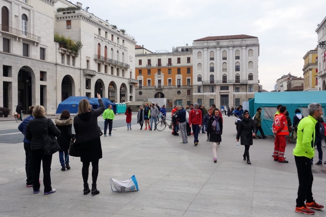 Um 9:15 Uhr geht es vor uns los, ohne Nationalhyme oder Startschuss. Eine große Musikkapelle schickt uns auf die Erlebnistour durch Brescia e dintorni, also Brescia und Umgebung. Vorbei an Gebäuden der Universität halten wir auf ein riesiges Krankenhaus zu. Kurz vor km 1 liegt schon ein Läufer am Boden, betreut von einer Gruppe von Sportlern und Helfern. Der Mann hat Glück im Unglück. Nach einem Herzstillstand beginnen zwei mitlaufende Kardiologen sofort mit der Wiederbelebung. Wie man am Montag liest, ist der 42-Jährige inzwischen über den Berg.