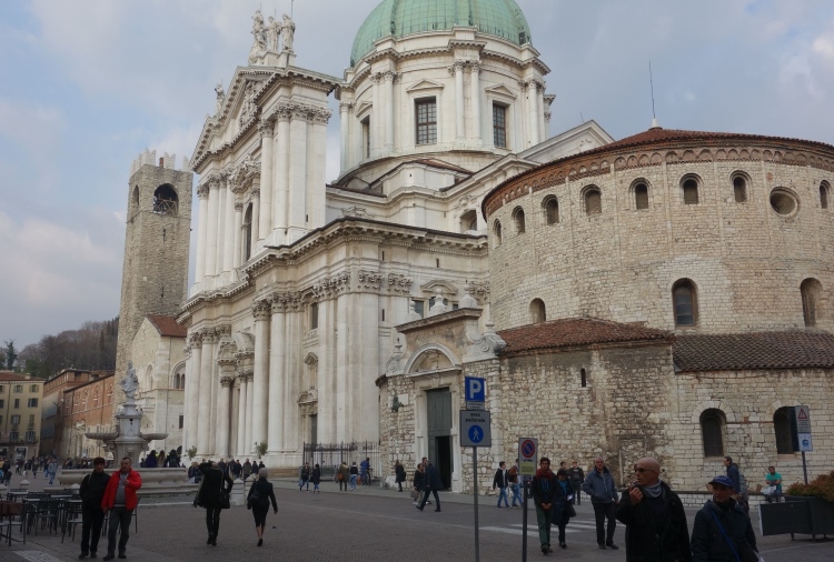 Was das Sightseeing betrifft, so ziehen die Veranstalter jetzt alle Register. Leider ist das mit der geistigen Aufnahmefähigkeit nach über 40 km so eine Sache. Durch den Hof des Broletto, der zu den beachtenswertesten Kommunalpalästen der Gegend zählt, gelangen wir auf die Piazza Paolo VI,, früher Piazza del Duomo genannt. Papst Paul VI wurde in Brescia geboren. Ihm ist ein Seitenaltar im neuen Dom gewidmet. Dessen Kuppel ist übrigens die drittgrößte Italiens.
