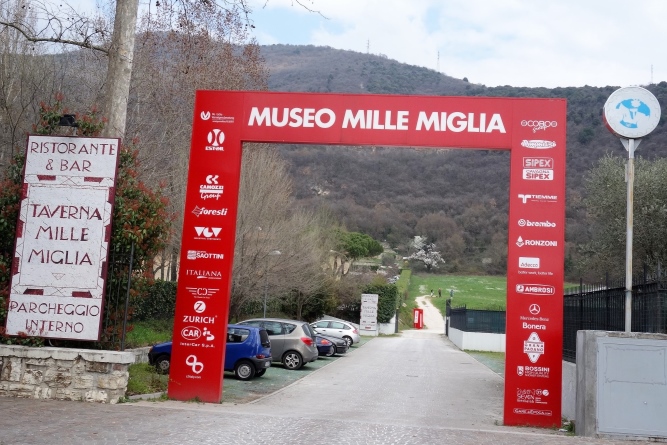 Highlight für die Autofans ist das rote Tor am rechten Wegesrand: In Brescia startet und endet das bekannte Oldtimerrennen Mille Miglia, von 1927 bis 1957 im italienischen Norden durchgeführt und 1977 wiederbelebt. Hier befindet sich das Museum dazu.