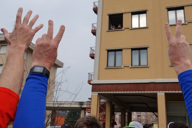 Pünktlich eine halbe Stunde vor dem Start stehen wir in unserem Abschnitt Griglia 3, quasi ganz hinten. Der Zugang wird kontrolliert, aber der Übergang nach vorne ist ohne Probleme möglich. Aufgedreht wie immer erlaube ich mir einige Kommentare zu dem riesigen Smartphone, das die junge Dame neben mir eifrig nutzt, um Textnachrichten zu schicken. Dabei vergesse ich, dass ich den Gegenwert an Fototechnik mit mir rumschleppe. Auf einmal erscheint auf ihrem Display ein großes rotes Herz mit „Ti amo“. Mein Hinweis an Judith bringt mir ein „Hättest du wohl auch gerne“ der Italienerin ein. Uff, es gibt also auch Fremdsprachenkenntnisse unter den Mitläufern. Ich schwöre hoch und heilig, künftig keine fremden Nachrichten mehr mitzulesen und verlasse noch mal den Startbereich. Ein Busch erspart mir und vielen anderen den Weg zu den Toiletten. Keiner der Wildbiesler ahnt, dass aus den umliegenden Hochhäusern kompromittierende Fotos geschossen werden, die ihren Weg auf Facebook finden und sogar von der bekannten Tageszeitung Corriere della Sera kommentiert werden. Bis jetzt ist das nicht so mein Tag.