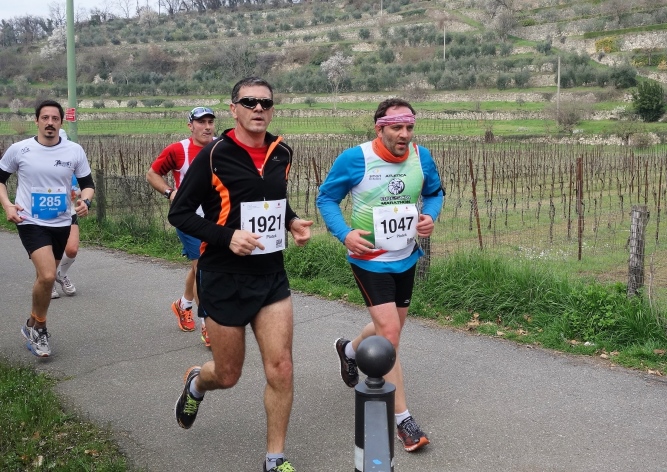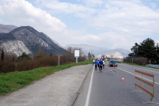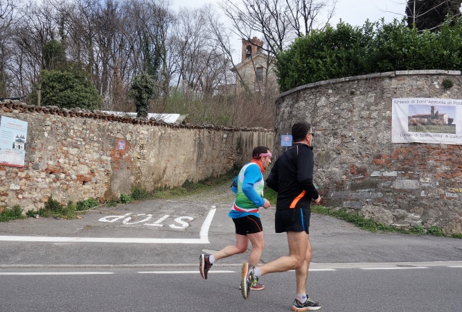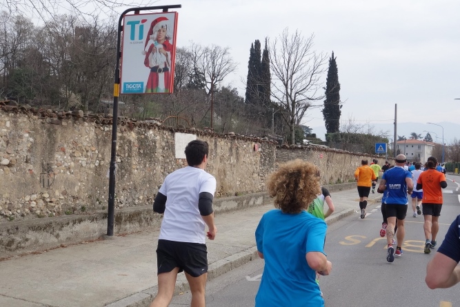 Ich bin heute wirklich gut drauf und habe mich inzwischen so weit vorgearbeitet, dass mir ein Sechs-Minuten-Schnitt für eine Zeit unter vier Stunden reichen würde. Und dann kommt ein langer Anstieg auf eine Eisenbahnbrücke. Für die Anstrengung wird man mit Ausblicken auf viele Steinbrüche in den Bergen belohnt. In Caionvico geht es mal wieder durch einen kleinen Ortskern. Die Vier-Stunden-Pacemaker samt Gefolge überholen mich. Aber heute hänge ich mich dran. In Sant Eufemia della Fonte hat sich um die beiden Musiker ein Grüppchen Schlachtenbummler versammelt. Da geht stimmungsmäßig schon fast die Post ab.