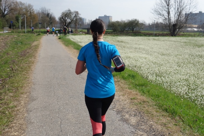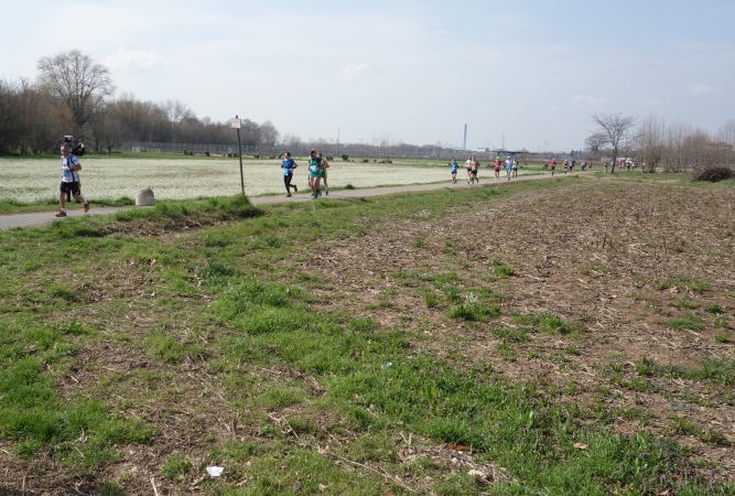 Drei neue Hochhäuser (Tre torri) liegen in einem Neubaugebiet. Hier ab Kilometer 23 sind wir in der südlichen Vorstadt. Die zwei Gitarrenspieler sind nur für die Läufer da. Zuschauer? Fehlanzeige. Kleinere Wohnstraßen mit Wegen durch die Felder wechseln sich ab. Links die Ausläufer der Alpen. Die Sonne scheint schön über die Frühlingsblumen. Auch wenn es nicht so ausschaut, müssen hier viele Menschen leben, da rechts von uns die Metrolinie verläuft.