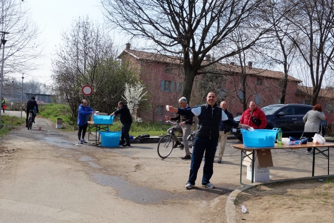 Kurz nach Kilometer 9 wird es dann wunderschön: Vor uns an einem Hügelchen liegt ein großes Landgut. Ein paar Meter geht es nun sanft bergauf und dann mit Blick auf die Bassa (Ebene) wieder hinunter. Das Villaggio Badia besteht aus vielen kleinen Einfamilienhäusern mit kleinen Gärten drumherum. Die Sträßlein haben hier Nummern, also Via Tredicesima bis Via Terza. Die Chiesa Sant' Antonio di Padova auf dem Hügel lädt inmitten von Weinreben zu Spiritualität und Besinnung ein. Das monströse Anwesen in den Weinterrassen trägt den Namen Cascina Badia Piccola. Ein gewisser Carlo vom Gardasee hat Spaß daran, auf allen Fotos seine Zunge herauszustrecken, wie ich zu Hause feststelle. Einen Teil der Bilder sortiere ich aus, den Rest der Chef.