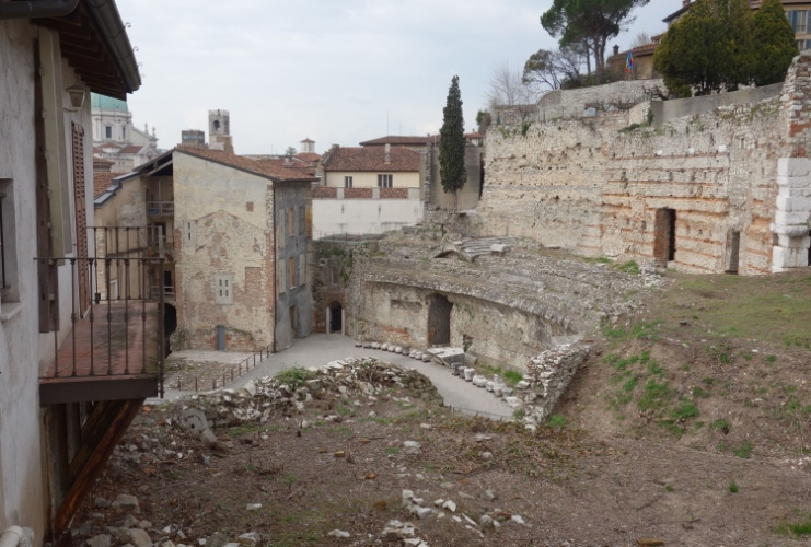 Kurz hinter km 40 betreten wir beim Denkmal für den mittelalterlichen Kirchenreformer Arnaldo da Brescia die Innenstadt. Es geht ins Weltkulturerbe "Die Langobarden in Italien". Vorbei am Kloster Santa Giulia, in dem sich heute das städtische Museum mit Zeugnissen aus keltischer, römischer und langobardischer Zeit befindet. In Erinnerung wird hier vor allem die stattliche Steigung bleiben. Danach die Reste des römischen Theaters, bevor der Blick auf den teilweise rekonstruierten Kapitolinischen Tempel fällt. Vor 32 Jahren war ich das letzte Mal hier. Wer hätte gedacht, dass ich an gleicher Stelle mal einen Marathon laufen würde?