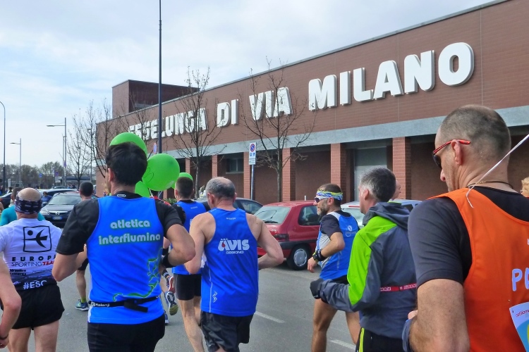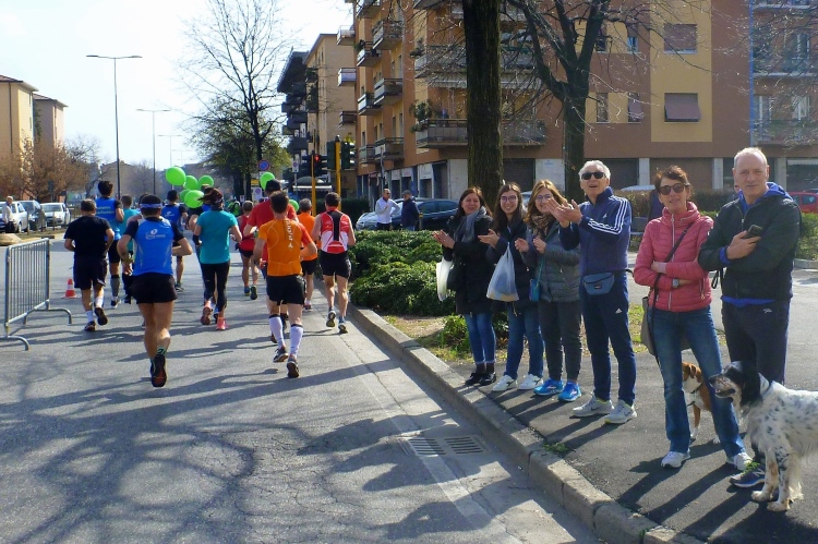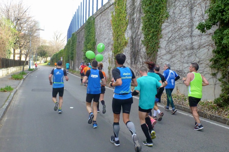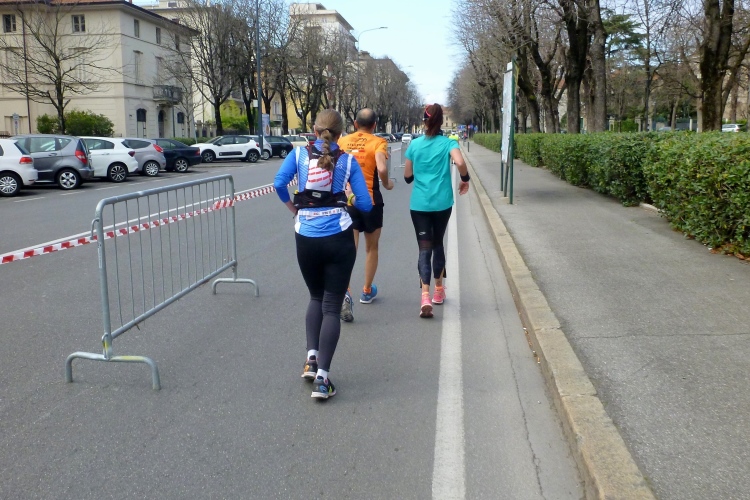 Wir sind jetzt im Südwesten und dürfen mal testen, wie stark eine Glasschutzwand den Lärm von Autobahn und Tangenziale abhält. Beim Durchqueren mehrerer Fußgängertunnel wird es noch mal eng. Unser Grüppchen überholt jetzt oft langsamere Gestalten. Drei neue Hochhäuser (Tre torri) liegen in einem Neubaugebiet. Hier bei Kilometer 23 sind wir in der südlichen Vorstadt. Kleinere Wohnstraßen, dann noch mal auf eine breite Allee mit Autoverkehr. In einer Unterführung die 25- km-Verpflegungsstelle, dann geht es auf netten Wegen in die Felder. Rechts taucht die Metro aus dem Untergrund auf und wird auf eine Brücke geleitet. Links die Ausläufer der Alpen. Die Sonne scheint, die Frühlingsblumen leuchten. Auch wenn es nicht so aussieht, müssen hier viele Menschen leben, da rechts von uns die Metrolinie verläuft. Das große Wohngebiet tangieren wir bei km 29, ich muss abreißen lassen. Schade.