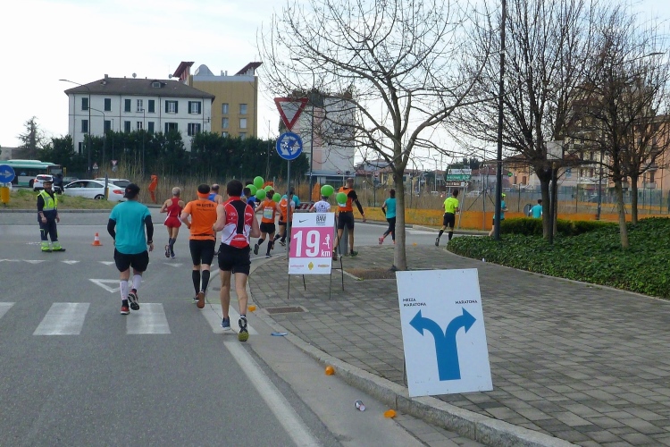 Die erste Marathonhälfte führt in die westlichen Vorstädte, abwechslungsreich beginnend über nette Sträßchen an malerischen Häusern vorbei, Gedränge inklusive. Das Museo del Ferro (Eisenmuseum), an einem romantischen Bach gelegen, lässt ahnen, dass wir in einem wichtigen Industriegebiet Italiens sind – obwohl hier alles wunderschön grün ist. Die ganze Laufstrecke werden wir gerade von Mandel- und Kirschblüten in sämtlichen Weiß- und Rottönen begleitet.